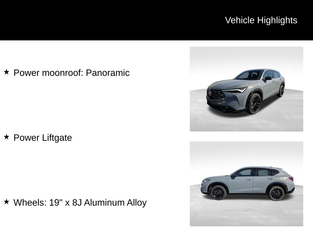ADX A-Spec Advance Package, AWD, Urban Gray Pearl, Power Liftgate, Power moonroof: Panoramic, Wheels: 19" x 8J Aluminum Alloy, 15 Speakers, 4-Wheel Disc Brakes, ABS brakes, Air Conditioning, Alloy wheels, AM/FM radio, Apple CarPlay/Android Auto, Auto High-beam Headlights, Auto-dimming Rear-View mirror, Automatic temperature control, Brake assist, Bumpers: body-color, Delay-off headlights, Driver door bin, Driver vanity mirror, Dual front impact airbags, Dual front side impact airbags, Electronic Stability Control, Emergency communication system: AcuraLink, Exterior Parking Camera Rear, Four wheel independent suspension, Front anti-roll bar, Front Bucket Seats, Front Center Armrest, Front dual zone A/C, Front fog lights, Front reading lights, Fully automatic headlights, Heated & Ventilated Front Bucket Seats, Heated door mirrors, Heated front seats, Heated steering wheel, Illuminated entry, Knee airbag, Lane departure: Lane Keeping Assist System (LKAS) active, Leather Shift Knob, Leather steering wheel, Leather Trimmed Seats, Low tire pressure warning, Memory seat, Navigation system: Google built-in (3-Years Unlimited Data Plan for In-Vehicle Apps), Occupant sensing airbag, Outside temperature display, Overhead airbag, Overhead console, Panic alarm, Passenger door bin, Passenger vanity mirror, Power door mirrors, Power driver seat, Power passenger seat, Power steering, Power windows, Radio data system, Radio: Bang & Olufsen Premium Audio System, Rain sensing wipers, Rear anti-roll bar, Rear reading lights, Rear seat center armrest, Rear side impact airbag, Rear window defroster, Rear window wiper, Remote keyless entry, Security system, Speed control, Speed-sensing steering, Split folding rear seat, Spoiler, Sport steering wheel, Steering wheel mounted audio controls, Tachometer, Telescoping steering wheel, Tilt steering wheel, Traction control, Trip computer, Turn signal indicator mirrors, Variably intermittent wipers, Ventilated front seats, ADX A-Spec Advance Package, AWD, Urban Gray Pearl, Power Liftgate, Power moonroof: Panoramic, Wheels: 19" x 8J Aluminum Alloy. * Fuel economy figures shown are provided from EPA mileage estimates and may not be comparable across different model years. Actual mileage will vary, depending on specific options selected, vehicle maintenance and your driving habits. Price includes: $1000 - 2025 ADX Sales Credit. Exp. 01/05/2026