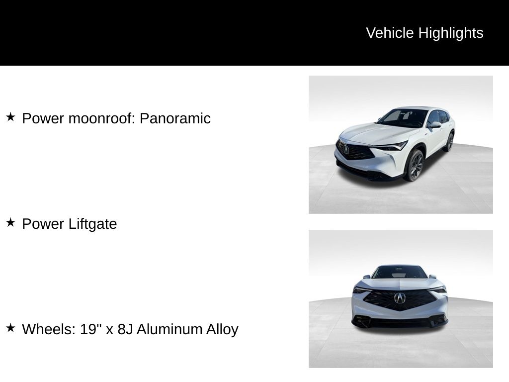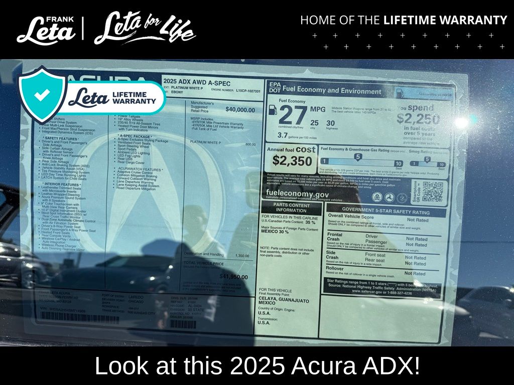 ADX A-Spec Package, 4D Sport Utility, AWD, Platinum White Pearl, Ebony w/Leather Trimmed Seats, Power Liftgate, Power moonroof: Panoramic, Wheels: 19" x 8J Aluminum Alloy, 4-Wheel Disc Brakes, 8 Speakers, ABS brakes, Air Conditioning, Alloy wheels, AM/FM radio, Apple CarPlay/Android Auto, Auto High-beam Headlights, Auto-dimming Rear-View mirror, Automatic temperature control, Brake assist, Bumpers: body-color, Delay-off headlights, Driver door bin, Driver vanity mirror, Dual front impact airbags, Dual front side impact airbags, Electronic Stability Control, Emergency communication system: AcuraLink, Exterior Parking Camera Rear, Four wheel independent suspension, Front anti-roll bar, Front Bucket Seats, Front Center Armrest, Front dual zone A/C, Front fog lights, Front reading lights, Fully automatic headlights, Heated & Ventilated Front Bucket Seats, Heated door mirrors, Heated front seats, Illuminated entry, Knee airbag, Lane departure: Lane Keeping Assist System (LKAS) active, Leather Shift Knob, Leather steering wheel, Leatherette Trimmed Seats w/ Microsuede Accents, Low tire pressure warning, Occupant sensing airbag, Outside temperature display, Overhead airbag, Overhead console, Panic alarm, Passenger door bin, Passenger vanity mirror, Power door mirrors, Power driver seat, Power passenger seat, Power steering, Power windows, Radio data system, Radio: AM/FM Acura Premium Audio System, Rear anti-roll bar, Rear reading lights, Rear seat center armrest, Rear side impact airbag, Rear window defroster, Rear window wiper, Remote keyless entry, Security system, Speed control, Speed-sensing steering, Split folding rear seat, Spoiler, Sport steering wheel, Steering wheel mounted audio controls, Tachometer, Telescoping steering wheel, Tilt steering wheel, Traction control, Trip computer, Turn signal indicator mirrors, Variably intermittent wipers, Ventilated front seats, ADX A-Spec Package, 4D Sport Utility, AWD, Platinum White Pearl, Ebony w/Leather Trimmed Seats, Power Liftgate, Power moonroof: Panoramic, Wheels: 19" x 8J Aluminum Alloy. Price includes: $1000 - 2025 ADX Sales Credit. Exp. 01/05/2026