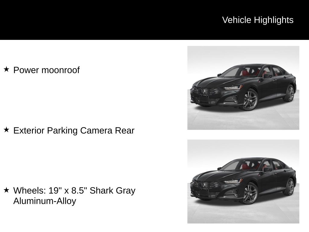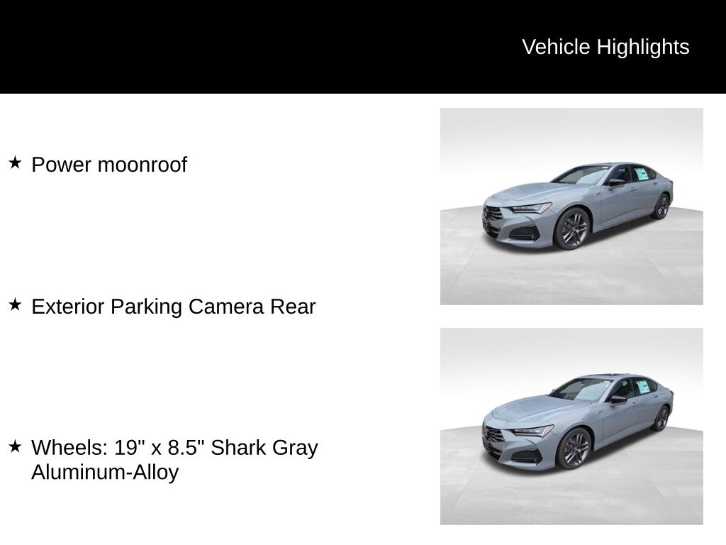 TLX A-Spec Package SH-AWD, AWD, Urban Gray Pearl, Exterior Parking Camera Rear, Power moonroof, Wheels: 19" x 8.5" Shark Gray Aluminum-Alloy, 17 Speakers, 4-Wheel Disc Brakes, ABS brakes, Acura Navigation System w/3D View, Air Conditioning, Alloy wheels, AM/FM radio: SiriusXM, Anti-whiplash front head restraints, Apple CarPlay/Android Auto, Auto High-beam Headlights, Auto-dimming Rear-View mirror, Automatic temperature control, Brake assist, Bumpers: body-color, Compass, Delay-off headlights, Driver door bin, Driver vanity mirror, Dual front impact airbags, Dual front side impact airbags, Electronic Stability Control, Emergency communication system: AcuraLink, Four wheel independent suspension, Front anti-roll bar, Front Bucket Seats, Front Center Armrest w/Storage, Front dual zone A/C, Front fog lights, Front reading lights, Garage door transmitter: HomeLink, Heated & Ventilated Front Sport Seats, Heated door mirrors, Heated front seats, HVAC memory, Illuminated entry, Knee airbag, Lane departure: Lane Keeping Assist System (LKAS) active, Leather steering wheel, Low tire pressure warning, Memory seat, Navigation system: Acura Navigation System with 3D View, Occupant sensing airbag, Outside temperature display, Overhead airbag, Overhead console, Panic alarm, Passenger door bin, Passenger vanity mirror, Power door mirrors, Power driver seat, Power passenger seat, Power steering, Power windows, Premium audio system: Acura/ELS Surround, Premium Perf Milano Leather & Ultrasuede Interior, Radio data system, Radio: ELS Studio 3D Premium Audio System, Rear anti-roll bar, Rear reading lights, Rear seat center armrest, Rear window defroster, Remote keyless entry, Security system, Speed control, Speed-sensing steering, Speed-Sensitive Wipers, Split folding rear seat, Spoiler, Sport steering wheel, Steering wheel mounted audio controls, Tachometer, Telescoping steering wheel, Tilt steering wheel, Traction control, Trip computer, Turn signal indicator mirrors, Variably intermittent wipers, Ventilated front seats, TLX A-Spec Package SH-AWD, AWD, Urban Gray Pearl, Exterior Parking Camera Rear, Power moonroof, Wheels: 19" x 8.5" Shark Gray Aluminum-Alloy. * Fuel economy figures shown are provided from EPA mileage estimates and may not be comparable across different model years. Actual mileage will vary, depending on specific options selected, vehicle maintenance and your driving habits.