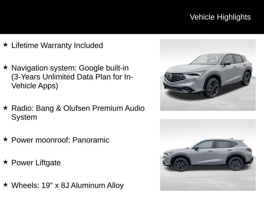 Step inside and experience the epitome of luxury. Meticulously crafted with premium materials, the ADX A-Spec Advance Package pampers you with heated and ventilated front seats, a heated steering wheel, and a panoramic moonroof that floods the cabin with natural light. The intuitive infotainment system, seamlessly integrated with Apple CarPlay and Android Auto, keeps you connected and entertained on every journey.