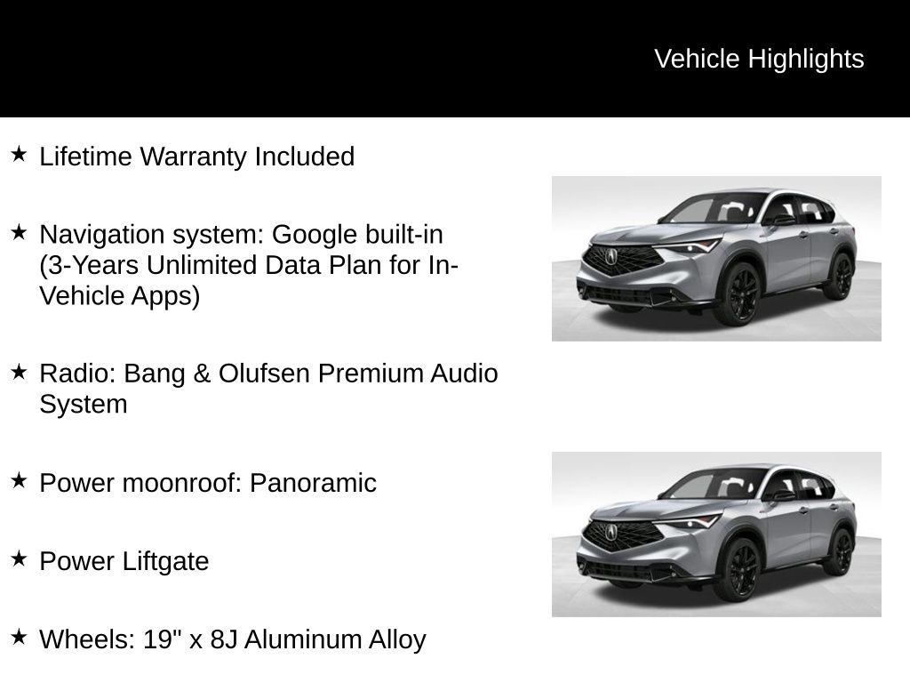 Powered by a 1.5L I4 Turbocharged DOHC 16V engine delivering 190 horsepower, the ADX A-Spec Advance Package offers the perfect balance of efficiency and exhilaration. Paired with Acura's renowned Continuously Variable Transmission (CVT) and All-Wheel Drive (AWD) system, this vehicle provides a smooth, confident, and responsive driving experience in any conditions.