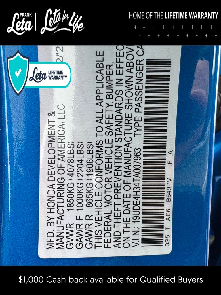 - VIN : 19UDE4H34TA007963