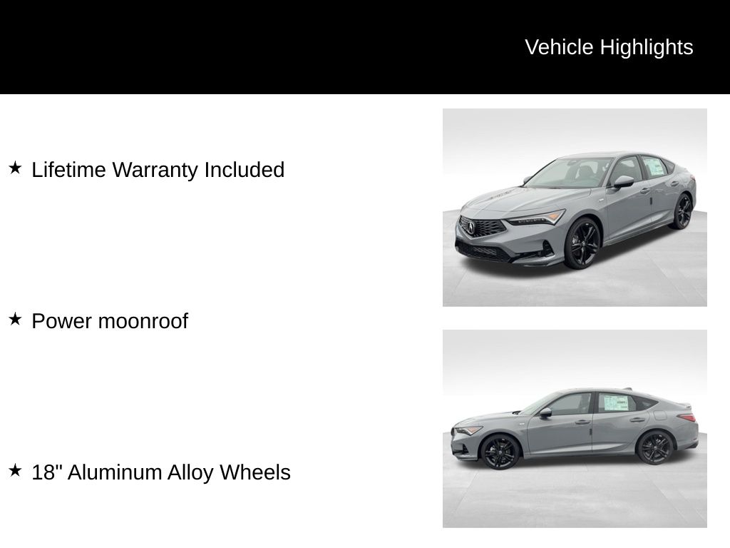The exterior of the Integra A-Spec exudes a bold and sophisticated presence, with its sleek Gray finish and striking 18-inch alloy wheels. The power moonroof and available LED lighting further enhance the vehicle's contemporary style, while the aerodynamic design ensures impressive efficiency.