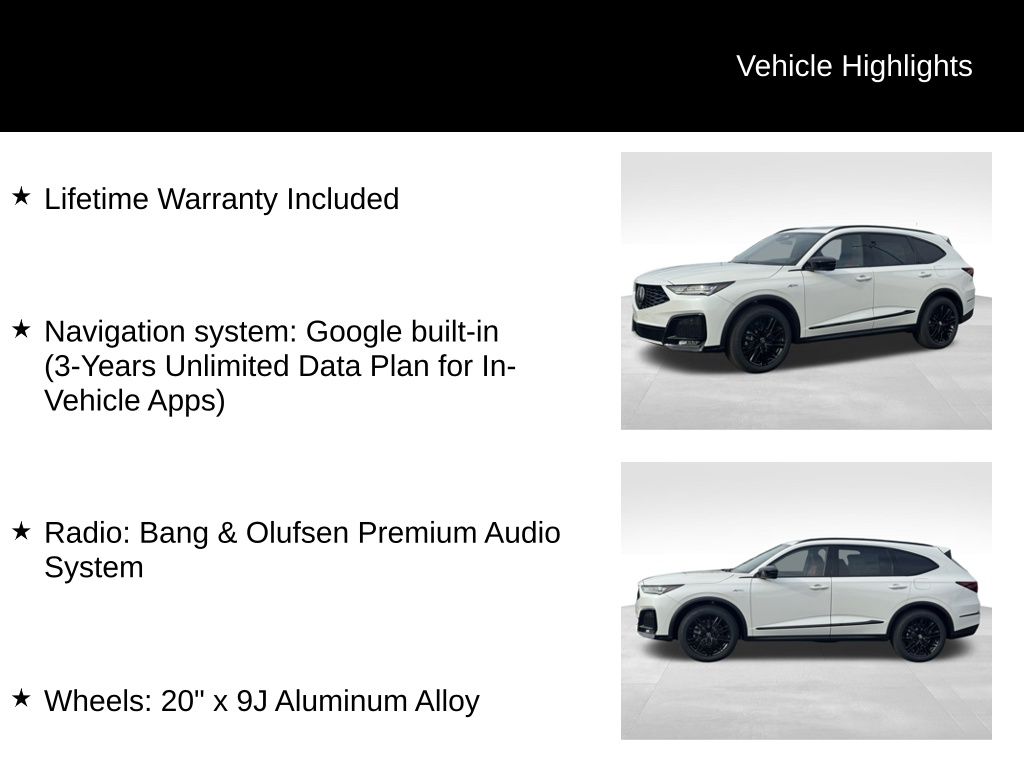 Elevate your driving experience with the MDX's cutting-edge technology. The intuitive Heads-Up Display keeps vital information in your line of sight, while the Google built-in Navigation system provides seamless connectivity and a 3-Year Unlimited Data Plan for in-vehicle apps. Immerse yourself in the concert-hall-quality sound of the Bang & Olufsen Premium Audio System, with 19 meticulously placed speakers.