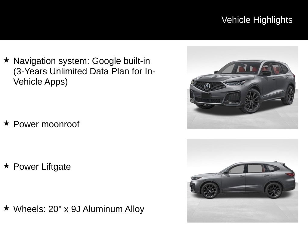 MDX A-Spec SH-AWD, 3.5L V6 SOHC i-VTEC 24V, AWD, Gray, Ebony w/Leatherette Trimmed Seats, Navigation system: Google built-in (3-Years Unlimited Data Plan for In-Vehicle Apps), Power Liftgate, Power moonroof, Wheels: 20" x 9J Aluminum Alloy, 19 Speakers, 3rd row seats: split-bench, 4-Wheel Disc Brakes, ABS brakes, Air Conditioning, Alloy wheels, Anti-whiplash front head restraints, Apple CarPlay/Android Auto, Audio memory, Auto High-beam Headlights, Auto tilt-away steering wheel, Auto-dimming Rear-View mirror, Automatic temperature control, Brake assist, Bumpers: body-color, Compass, Delay-off headlights, Driver door bin, Driver vanity mirror, Dual front impact airbags, Dual front side impact airbags, Electronic Stability Control, Emergency communication system: AcuraLink, Exterior Parking Camera Rear, Four wheel independent suspension, Front anti-roll bar, Front Bucket Seats, Front Center Armrest, Front dual zone A/C, Front fog lights, Front reading lights, Fully automatic headlights, Garage door transmitter: HomeLink, Heated & Ventilated Front Sport Seats, Heated door mirrors, Heated front seats, HVAC memory, Illuminated entry, Knee airbag, Lane departure: Lane Keeping Assist System (LKAS) active, Leather steering wheel, Low tire pressure warning, Memory seat, Occupant sensing airbag, Outside temperature display, Overhead airbag, Overhead console, Panic alarm, Passenger door bin, Passenger vanity mirror, Perforated Premium Milano Lthr & Ultrasuede Seats, Power door mirrors, Power driver seat, Power passenger seat, Power steering, Power windows, Premium audio system: Acura/ELS Studio 3D, Radio data system, Radio: Bang & Olufsen Premium Audio System, Rain sensing wipers, Rear air conditioning, Rear anti-roll bar, Rear reading lights, Rear seat center armrest, Rear window defroster, Rear window wiper, Remote keyless entry, Security system, Speed control, Speed-sensing steering, Speed-Sensitive Wipers, Split folding rear seat, Spoiler, Sport steering wheel, Steering wheel memory, Steering wheel mounted audio controls, Tachometer, Telescoping steering wheel, Tilt steering wheel, Traction control, Trip computer, Turn signal indicator mirrors, Variably intermittent wipers, Ventilated front seats, MDX A-Spec SH-AWD, 3.5L V6 SOHC i-VTEC 24V, AWD, Gray, Ebony w/Leatherette Trimmed Seats, Navigation system: Google built-in (3-Years Unlimited Data Plan for In-Vehicle Apps), Power Liftgate, Power moonroof, Wheels: 20" x 9J Aluminum Alloy. * Fuel economy figures shown are provided from EPA mileage estimates and may not be comparable across different model years. Actual mileage will vary, depending on specific options selected, vehicle maintenance and your driving habits.
