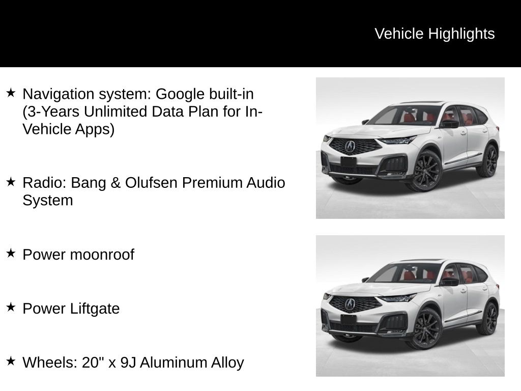 MDX A-Spec SH-AWD, 3.5L V6 SOHC i-VTEC 24V, AWD, Red w/Curvilinear Qltd Perforated Prem Milano Lthr Seats, Navigation system: Google built-in (3-Years Unlimited Data Plan for In-Vehicle Apps), Power Liftgate, Power moonroof, Radio: Bang & Olufsen Premium Audio System, Wheels: 20" x 9J Aluminum Alloy, 19 Speakers, 3rd row seats: split-bench, 4-Wheel Disc Brakes, ABS brakes, Air Conditioning, Alloy wheels, Anti-whiplash front head restraints, Apple CarPlay/Android Auto, Audio memory, Auto High-beam Headlights, Auto tilt-away steering wheel, Auto-dimming Rear-View mirror, Automatic temperature control, Brake assist, Bumpers: body-color, Compass, Delay-off headlights, Driver door bin, Driver vanity mirror, Dual front impact airbags, Dual front side impact airbags, Electronic Stability Control, Emergency communication system: AcuraLink, Exterior Parking Camera Rear, Four wheel independent suspension, Front anti-roll bar, Front Bucket Seats, Front Center Armrest, Front dual zone A/C, Front fog lights, Front reading lights, Fully automatic headlights, Garage door transmitter: HomeLink, Heated & Ventilated Front Sport Seats, Heated door mirrors, Heated front seats, HVAC memory, Illuminated entry, Knee airbag, Lane departure: Lane Keeping Assist System (LKAS) active, Leather steering wheel, Low tire pressure warning, Memory seat, Occupant sensing airbag, Outside temperature display, Overhead airbag, Overhead console, Panic alarm, Passenger door bin, Passenger vanity mirror, Perforated Premium Milano Lthr & Ultrasuede Seats, Power door mirrors, Power driver seat, Power passenger seat, Power steering, Power windows, Premium audio system: Acura/ELS Studio 3D, Radio data system, Rain sensing wipers, Rear air conditioning, Rear anti-roll bar, Rear reading lights, Rear seat center armrest, Rear window defroster, Rear window wiper, Remote keyless entry, Security system, Speed control, Speed-sensing steering, Speed-Sensitive Wipers, Split folding rear seat, Spoiler, Sport steering wheel, Steering wheel memory, Steering wheel mounted audio controls, Tachometer, Telescoping steering wheel, Tilt steering wheel, Traction control, Trip computer, Turn signal indicator mirrors, Variably intermittent wipers, Ventilated front seats, MDX A-Spec SH-AWD, 3.5L V6 SOHC i-VTEC 24V, AWD, Red w/Curvilinear Qltd Perforated Prem Milano Lthr Seats, Navigation system: Google built-in (3-Years Unlimited Data Plan for In-Vehicle Apps), Power Liftgate, Power moonroof, Radio: Bang & Olufsen Premium Audio System, Wheels: 20" x 9J Aluminum Alloy. * Fuel economy figures shown are provided from EPA mileage estimates and may not be comparable across different model years. Actual mileage will vary, depending on specific options selected, vehicle maintenance and your driving habits.