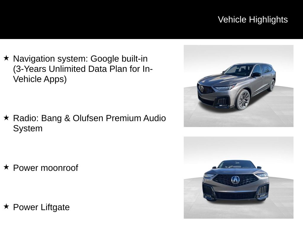 MDX A-Spec SH-AWD, 3.5L V6 SOHC i-VTEC 24V, AWD, Liquid Carbon Metallic, Ebony w/Curvilinear Qltd Perforated Prem Milano Lthr Seats, Navigation system: Google built-in (3-Years Unlimited Data Plan for In-Vehicle Apps), Power Liftgate, Power moonroof, Radio: Bang & Olufsen Premium Audio System, 19 Speakers, 3rd row seats: split-bench, 4-Wheel Disc Brakes, ABS brakes, Air Conditioning, Alloy wheels, Anti-whiplash front head restraints, Apple CarPlay/Android Auto, Audio memory, Auto High-beam Headlights, Auto tilt-away steering wheel, Auto-dimming Rear-View mirror, Automatic temperature control, Brake assist, Bumpers: body-color, Compass, Delay-off headlights, Driver door bin, Driver vanity mirror, Dual front impact airbags, Dual front side impact airbags, Electronic Stability Control, Emergency communication system: AcuraLink, Exterior Parking Camera Rear, Four wheel independent suspension, Front anti-roll bar, Front Bucket Seats, Front Center Armrest, Front dual zone A/C, Front fog lights, Front reading lights, Fully automatic headlights, Garage door transmitter: HomeLink, Heated & Ventilated Front Sport Seats, Heated door mirrors, Heated front seats, HVAC memory, Illuminated entry, Knee airbag, Lane departure: Lane Keeping Assist System (LKAS) active, Leather steering wheel, Low tire pressure warning, Memory seat, Occupant sensing airbag, Outside temperature display, Overhead airbag, Overhead console, Panic alarm, Passenger door bin, Passenger vanity mirror, Perforated Premium Milano Lthr & Ultrasuede Seats, Power door mirrors, Power driver seat, Power passenger seat, Power steering, Power windows, Premium audio system: Acura/ELS Studio 3D, Radio data system, Rain sensing wipers, Rear air conditioning, Rear anti-roll bar, Rear reading lights, Rear seat center armrest, Rear window defroster, Rear window wiper, Remote keyless entry, Security system, Speed control, Speed-sensing steering, Speed-Sensitive Wipers, Split folding rear seat, Spoiler, Sport steering wheel, Steering wheel memory, Steering wheel mounted audio controls, Tachometer, Telescoping steering wheel, Tilt steering wheel, Traction control, Trip computer, Turn signal indicator mirrors, Variably intermittent wipers, Ventilated front seats, Wheels: 20" x 9J Aluminum Alloy, MDX A-Spec SH-AWD, 3.5L V6 SOHC i-VTEC 24V, AWD, Liquid Carbon Metallic, Ebony w/Curvilinear Qltd Perforated Prem Milano Lthr Seats, Navigation system: Google built-in (3-Years Unlimited Data Plan for In-Vehicle Apps), Power Liftgate, Power moonroof, Radio: Bang & Olufsen Premium Audio System. * Fuel economy figures shown are provided from EPA mileage estimates and may not be comparable across different model years. Actual mileage will vary, depending on specific options selected, vehicle maintenance and your driving habits.