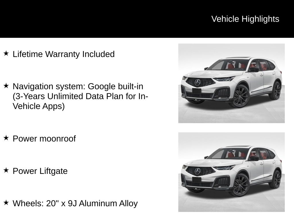 Under the hood, the 3.5L V6 SOHC i-VTEC 24V engine, paired with a 10-Speed Automatic transmission and Acura's renowned SH-AWD system, delivers an exhilarating driving experience. With an impressive EPA-estimated 19 MPG in the city and 25 MPG on the highway, this MDX A-Spec combines power and efficiency for the ultimate in versatility.
