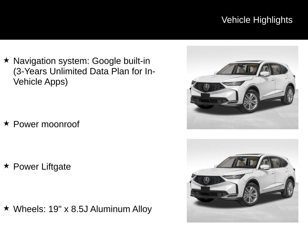 3.5L V6 SOHC i-VTEC 24V, AWD, Solar Silver Metallic, Ebony w/Leatherette Trimmed Seats, Navigation system: Google built-in (3-Years Unlimited Data Plan for In-Vehicle Apps), Power Liftgate, Power moonroof, Wheels: 19" x 8.5J Aluminum Alloy, 11 Speakers, 3rd row seats: split-bench, 4-Wheel Disc Brakes, ABS brakes, Air Conditioning, Alloy wheels, AM/FM radio, Anti-whiplash front head restraints, Apple CarPlay/Android Auto, Audio memory, Auto High-beam Headlights, Auto tilt-away steering wheel, Auto-dimming Rear-View mirror, Automatic temperature control, Brake assist, Bumpers: body-color, Compass, Delay-off headlights, Driver door bin, Driver vanity mirror, Dual front impact airbags, Dual front side impact airbags, Electronic Stability Control, Emergency communication system: AcuraLink, Exterior Parking Camera Rear, Four wheel independent suspension, Front anti-roll bar, Front Bucket Seats, Front Center Armrest, Front dual zone A/C, Front reading lights, Fully automatic headlights, Garage door transmitter: HomeLink, Heated door mirrors, Heated front seats, Heated Front Sport Seats, HVAC memory, Illuminated entry, Knee airbag, Lane departure: Lane Keeping Assist System (LKAS) active, Leather steering wheel, Leatherette Trimmed Seats, Low tire pressure warning, Memory seat, Occupant sensing airbag, Outside temperature display, Overhead airbag, Overhead console, Panic alarm, Passenger door bin, Passenger vanity mirror, Power door mirrors, Power driver seat, Power passenger seat, Power steering, Power windows, Radio data system, Radio: AM/FM Acura Premium Audio System, Rear air conditioning, Rear anti-roll bar, Rear reading lights, Rear seat center armrest, Rear window defroster, Rear window wiper, Remote keyless entry, Security system, Speed control, Speed-sensing steering, Speed-Sensitive Wipers, Split folding rear seat, Spoiler, Steering wheel memory, Steering wheel mounted audio controls, Tachometer, Telescoping steering wheel, Tilt steering wheel, Traction control, Trip computer, Turn signal indicator mirrors, Variably intermittent wipers, 3.5L V6 SOHC i-VTEC 24V, AWD, Solar Silver Metallic, Ebony w/Leatherette Trimmed Seats, Navigation system: Google built-in (3-Years Unlimited Data Plan for In-Vehicle Apps), Power Liftgate, Power moonroof, Wheels: 19" x 8.5J Aluminum Alloy. * Fuel economy figures shown are provided from EPA mileage estimates and may not be comparable across different model years. Actual mileage will vary, depending on specific options selected, vehicle maintenance and your driving habits.