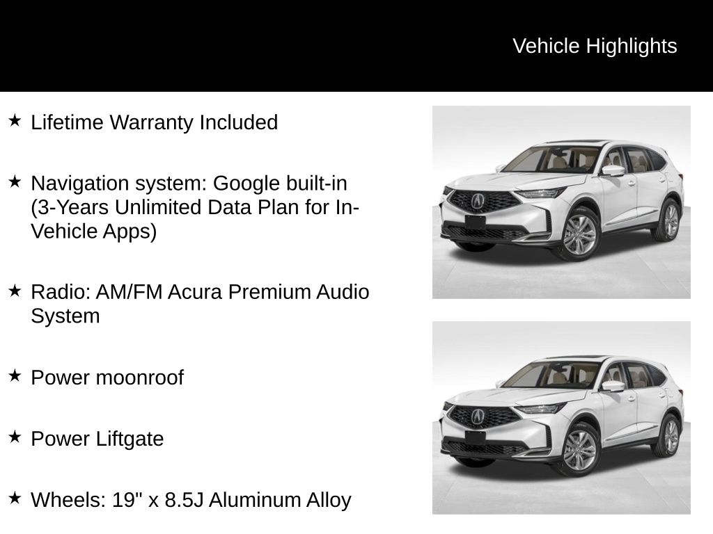 Powered by a potent 3.5L V6 SOHC i-VTEC 24V engine and paired with a smooth-shifting 10-Speed Automatic transmission, the MDX delivers a dynamic and efficient performance, with an EPA-estimated 19 MPG in the city and 25 MPG on the highway. The Acura Super Handling All-Wheel Drive (SH-AWD) system provides exceptional traction and control, ensuring a confident and secure driving experience in any conditions.