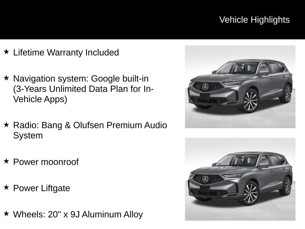 Beyond these standout features, the MDX Technology Package SH-AWD offers a wealth of advanced technologies and creature comforts. Enjoy the convenience of 19 Speakers, a Premium audio system, Automatic temperature control, and a Memory seat. Stay connected with Apple CarPlay/Android Auto, while the Lane Keeping Assist System and Rear Parking Camera provide added peace of mind.