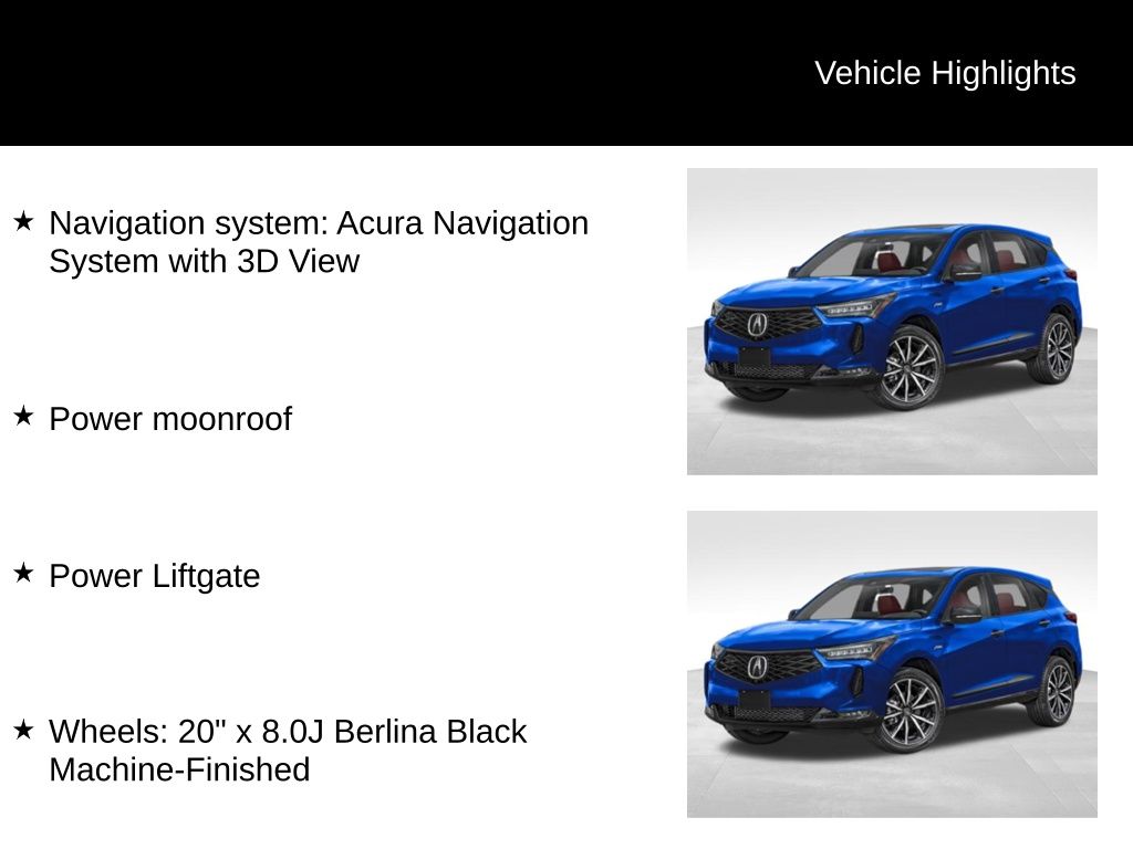 RDX A-Spec Advance Package SH-AWD, 2.0L 16V DOHC, AWD, Liquid Carbon Metallic, Navigation system: Acura Navigation System with 3D View, Power Liftgate, Power moonroof, Wheels: 20" x 8.0J Berlina Black Machine-Finished, 16 Speakers, 4-Wheel Disc Brakes, ABS brakes, Adaptive suspension, Air Conditioning, Alloy wheels, AM/FM radio: SiriusXM, Apple CarPlay/Android Auto, Auto High-beam Headlights, Auto-dimming Rear-View mirror, Automatic temperature control, Brake assist, Bumpers: body-color, Compass, Delay-off headlights, Driver door bin, Driver vanity mirror, Dual front impact airbags, Dual front side impact airbags, Electronic Stability Control, Emergency communication system: AcuraLink, Exterior Parking Camera Rear, Four wheel independent suspension, Front anti-roll bar, Front Bucket Seats, Front Center Armrest, Front dual zone A/C, Front fog lights, Front reading lights, Fully automatic headlights, Garage door transmitter: HomeLink, Heads-Up Display, Heated and Ventilated Front Sport Seats, Heated door mirrors, Heated front seats, Heated rear seats, Heated steering wheel, Illuminated entry, Knee airbag, Lane departure: Lane Keeping Assist System (LKAS) active, Low tire pressure warning, Memory seat, Occupant sensing airbag, Outside temperature display, Overhead airbag, Overhead console, Panic alarm, Passenger door bin, Passenger vanity mirror, Perforated Milano Premium Leather-Trimmed Interior, Power door mirrors, Power driver seat, Power passenger seat, Power steering, Power windows, Radio data system, Radio: ELS Studio 3D Premium Audio System, Rain sensing wipers, Rear anti-roll bar, Rear reading lights, Rear seat center armrest, Rear window defroster, Rear window wiper, Remote keyless entry, Security system, Speed control, Speed-sensing steering, Split folding rear seat, Spoiler, Sport steering wheel, Steering wheel mounted audio controls, Tachometer, Telescoping steering wheel, Tilt steering wheel, Traction control, Trip computer, Turn signal indicator mirrors, Variably intermittent wipers, Ventilated front seats, RDX A-Spec Advance Package SH-AWD, 2.0L 16V DOHC, AWD, Liquid Carbon Metallic, Navigation system: Acura Navigation System with 3D View, Power Liftgate, Power moonroof, Wheels: 20" x 8.0J Berlina Black Machine-Finished. * Fuel economy figures shown are provided from EPA mileage estimates and may not be comparable across different model years. Actual mileage will vary, depending on specific options selected, vehicle maintenance and your driving habits.