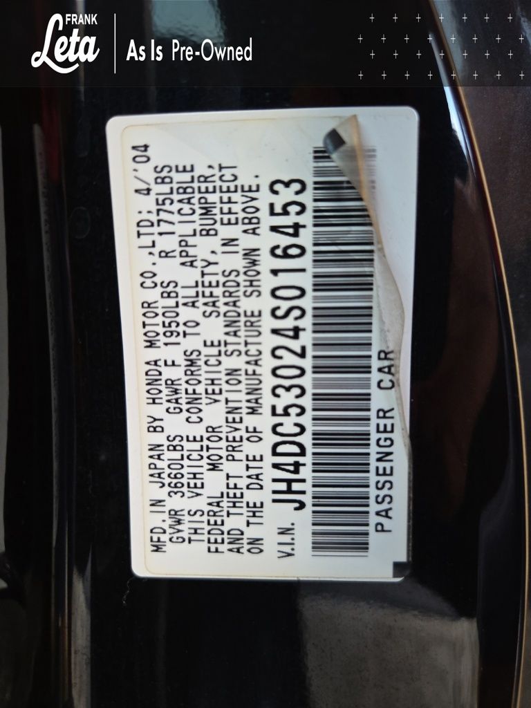 CARFAX One-Owner. 2004 Acura RSX Type S Nighthawk Black Pearl RSX Type S, 2D Coupe, 2.0L I4 16V SMPI DOHC i-VTEC, 6-Speed Manual with Overdrive, FWD, Nighthawk Black Pearl, Ebony w/Perforated Leather-Trimmed Seats, 16" x 6.5" JJ 5-Spoke Cast Alloy Wheels, Power moonroof, Premium audio system: Acura/Bose, 4-Wheel Disc Brakes, 7 Speakers, ABS brakes, Acura/Bose Music System w/AM/FM/Cass./6-CD, Air Conditioning, AM/FM radio, Automatic temperature control, Bumpers: body-color, Cassette, CD player, Driver door bin, Driver vanity mirror, Dual front impact airbags, Dual front side impact airbags, Four wheel independent suspension, Front anti-roll bar, Front Bucket Seats, Front reading lights, Front Sport Bucket Seats, Heated door mirrors, Leather steering wheel, Occupant sensing airbag, Panic alarm, Passenger door bin, Passenger vanity mirror, Perforated Leather-Trimmed Seats, Power door mirrors, Power steering, Power windows, Rear anti-roll bar, Rear window defroster, Rear window wiper, Remote keyless entry, Security system, Speed control, Speed-sensing steering, Speed-Sensitive Wipers, Split folding rear seat, Tachometer, Tilt steering wheel, Variably intermittent wipers, RSX Type S, 2D Coupe, 2.0L I4 16V SMPI DOHC i-VTEC, 6-Speed Manual with Overdrive, FWD, Nighthawk Black Pearl, Ebony w/Perforated Leather-Trimmed Seats, 16" x 6.5" JJ 5-Spoke Cast Alloy Wheels, Power moonroof, Premium audio system: Acura/Bose. 2.0L I4 16V SMPI DOHC i-VTEC 6-Speed Manual with Overdrive FWD 2D Coupe 24/31 City/Highway MPG
