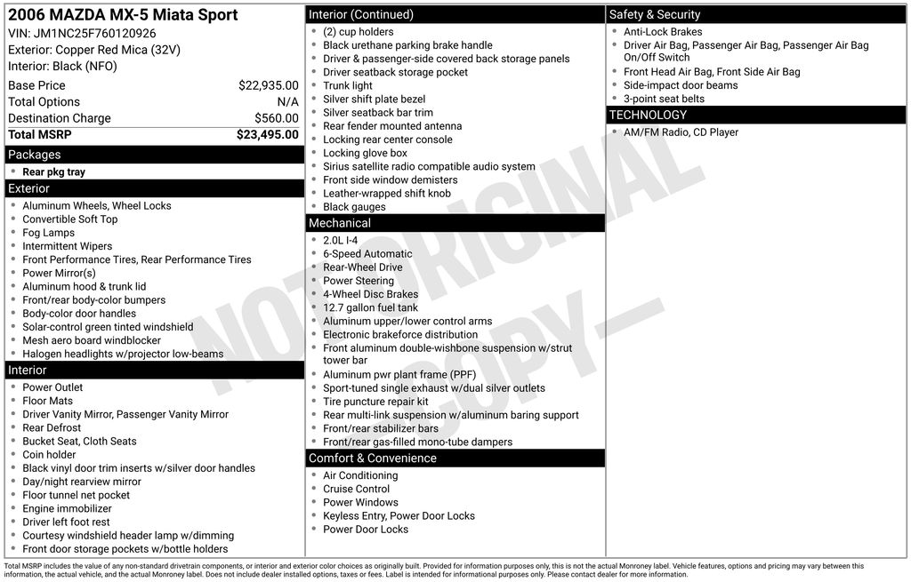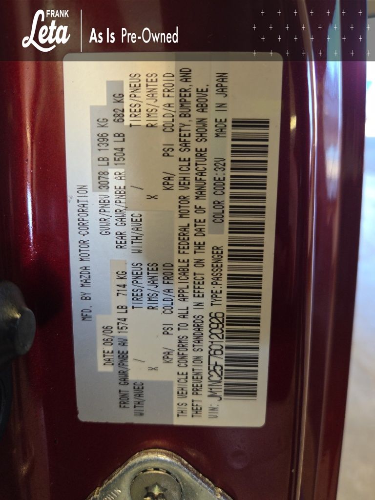 2006 Mazda Miata Sport Copper Red Mica Miata Sport, 2.0L I4 DOHC VVT 16V, 6-Speed Automatic Sport, RWD, Copper Red Mica, Black w/Cloth Upholstery, 17" Aluminum Alloy Wheels w/Wheel Locks, Front fog lights, Leather Shift Knob, 4 Speakers, 4-Wheel Disc Brakes, ABS brakes, Air Conditioning, AM/FM Stereo w/Single CD Player, Bumpers: body-color, CD player, Cloth Upholstery, Convertible roof wind blocker, Driver vanity mirror, Dual front impact airbags, Dual front side impact airbags, Four wheel independent suspension, Front anti-roll bar, Front Bucket Seats, Glass rear window, Occupant sensing airbag, Panic alarm, Passenger cancellable airbag, Passenger vanity mirror, Power door mirrors, Power steering, Power windows, Rear anti-roll bar, Rear window defroster, Reclining Front Bucket Seats, Remote keyless entry, Speed control, Speed-sensing steering, Sport steering wheel, Steering wheel mounted audio controls, Tachometer, Tilt steering wheel, Miata Sport, 2.0L I4 DOHC VVT 16V, 6-Speed Automatic Sport, RWD, Copper Red Mica, Black w/Cloth Upholstery, 17" Aluminum Alloy Wheels w/Wheel Locks, Front fog lights, Leather Shift Knob. 2.0L I4 DOHC VVT 16V 6-Speed Automatic Sport RWD 2D Convertible Odometer is 56688 miles below market average! 23/30 City/Highway MPG