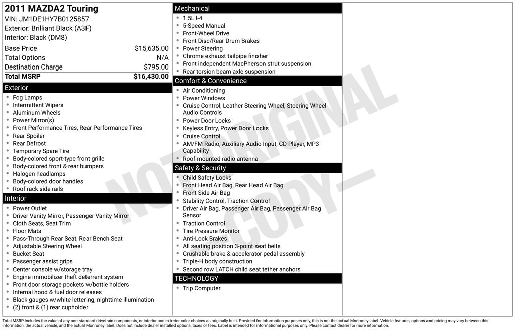 2011 Mazda Mazda2 Touring Brilliant Black Clearcoat Low Miles, Mazda2 Touring, 1.5L I4 DOHC 16V, 5-Speed Manual, FWD, Brilliant Black Clearcoat, 15" x 6.0J Alloy Wheels, Front fog lights, 6 Speakers, ABS brakes, Air Conditioning, AM/FM radio, AM/FM/CD/MP3 Audio System w/6 Speakers, Brake assist, Bumpers: body-color, CD player, Cloth Upholstery, Driver door bin, Driver vanity mirror, Dual front impact airbags, Dual front side impact airbags, Electronic Stability Control, Front anti-roll bar, Front Bucket Seats, Front wheel independent suspension, Illuminated entry, Low tire pressure warning, Occupant sensing airbag, Outside temperature display, Overhead airbag, Panic alarm, Passenger door bin, Passenger vanity mirror, Power door mirrors, Power steering, Power windows, Rear window defroster, Rear window wiper, Reclining Front Bucket Seats, Remote keyless entry, Speed control, Speed-sensing steering, Split folding rear seat, Spoiler, Steering wheel mounted audio controls, Tachometer, Tilt steering wheel, Traction control, Trip computer, Variably intermittent wipers, Mazda2 Touring, 1.5L I4 DOHC 16V, 5-Speed Manual, FWD, Brilliant Black Clearcoat, 15" x 6.0J Alloy Wheels, Front fog lights. 1.5L I4 DOHC 16V 5-Speed Manual FWD 4D Hatchback Odometer is 52353 miles below market average! 29/35 City/Highway MPG
