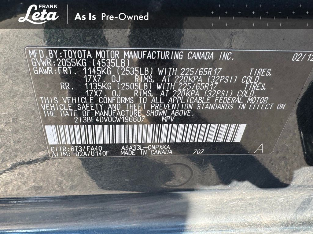 - VIN : 2T3BF4DV0CW196607