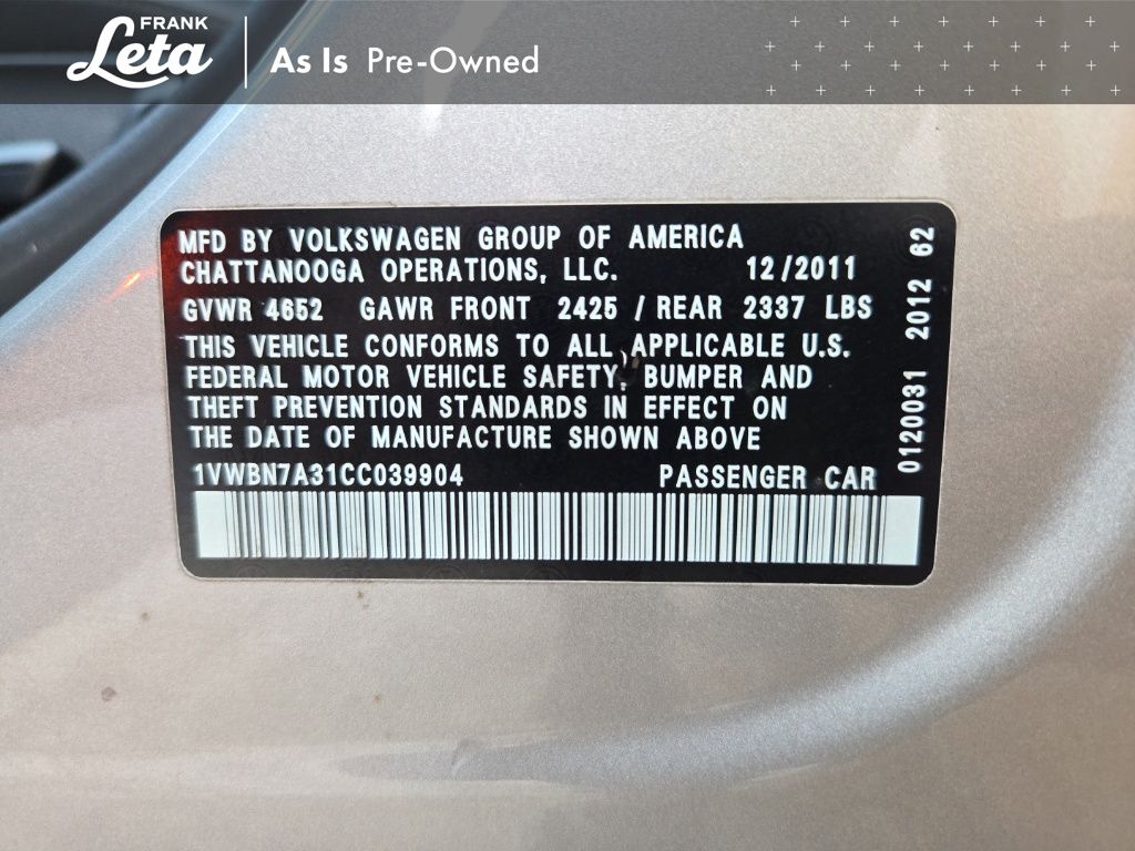 2012 Volkswagen Passat TDI SE Reflex Silver Metallic Passat TDI SE, 2.0L TDI Turbodiesel, 6-Speed Automatic DSG, Reflex Silver Metallic, Titan Black w/Cloth Seating Surfaces, Heated front seats, 17" Sonoma Alloy Wheels, 4-Wheel Disc Brakes, 8 Speakers, ABS brakes, Air Conditioning, Alloy wheels, AM/FM radio: SiriusXM, Auto-dimming Rear-View mirror, Automatic temperature control, Brake assist, Bumpers: body-color, CD player, Compass, Delay-off headlights, Driver door bin, Driver vanity mirror, Dual front impact airbags, Dual front side impact airbags, Electronic Stability Control, Four wheel independent suspension, Front anti-roll bar, Front Bucket Seats, Front Center Armrest, Front dual zone A/C, Front reading lights, Fully automatic headlights, Heatable Front Bucket Seats, Heated door mirrors, Illuminated entry, Leather Shift Knob, Leather steering wheel, Low tire pressure warning, Occupant sensing airbag, Outside temperature display, Overhead airbag, Overhead console, Panic alarm, Passenger door bin, Passenger vanity mirror, Power door mirrors, Power driver seat, Power steering, Power windows, Radio data system, Radio: Premium 8 Touch-Screen w/6-CD Changer, Rear anti-roll bar, Rear reading lights, Rear seat center armrest, Rear window defroster, Remote keyless entry, Speed control, Speed-sensing steering, Split folding rear seat, Steering wheel mounted audio controls, Tachometer, Telescoping steering wheel, Tilt steering wheel, Traction control, Trip computer, Turn signal indicator mirrors, V-Tex Leatherette Seating Surfaces, Variably intermittent wipers, Passat TDI SE, 2.0L TDI Turbodiesel, 6-Speed Automatic DSG, Reflex Silver Metallic, Titan Black w/Cloth Seating Surfaces, Heated front seats. 2.0L TDI Turbodiesel 6-Speed Automatic DSG FWD 4D Sedan Odometer is 41645 miles below market average! 31/43 City/Highway MPG Awards: