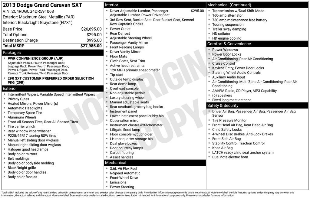 2013 Dodge Grand Caravan SXT Maximum Steel Metallic Clearcoat Grand Caravan SXT, 3.6L 6-Cylinder SMPI Flex Fuel DOHC, FWD, Maximum Steel Metallic Clearcoat, Black/Light Graystone Cloth, 17" x 6.5" Aluminum Wheels, 2nd Row Buckets w/Fold-In-Floor, 3rd row seats: split-bench, Front dual zone A/C, Heated door mirrors, Power Liftgate, Rear air conditioning, 3.16 Axle Ratio, 4-Wheel Disc Brakes, 6 Speakers, ABS brakes, Air Conditioning, AM/FM radio, Anti-whiplash front head restraints, Audio Jack Input for Mobile Devices, Black Side Roof Rails, Bodyside moldings, Brake assist, Bumpers: body-color, CD player, Cloth Low-Back Bucket Seats, Delay-off headlights, Driver door bin, Driver vanity mirror, Driver's Seat Mounted Armrest, Dual front impact airbags, Dual front side impact airbags, Electronic Stability Control, Front anti-roll bar, Front Bucket Seats, Front reading lights, Front wheel independent suspension, Illuminated entry, Integrated Roof Rail Crossbars, Knee airbag, Left Power Sliding Door, Low tire pressure warning, Occupant sensing airbag, Outside temperature display, Overhead airbag, Overhead console, Panic alarm, Passenger door bin, Passenger seat mounted armrest, Passenger vanity mirror, Power 2-Way Driver Lumbar Adjust, Power 8-Way Driver Seat, Power Adjustable Pedals, Power Convenience Group I, Power door mirrors, Power steering, Power windows, Quick Order Package 29R, Radio: Uconnect 130 AM/FM/CD/MP3, Rear window defroster, Rear window wiper, Reclining 3rd row seat, Remote keyless entry, Right Power Sliding Door, Speed control, Split folding rear seat, Spoiler, Steering Wheel Mounted Audio Controls, Steering wheel mounted audio controls, Super Console, Tachometer, Telescoping steering wheel, Tilt steering wheel, Touring Suspension, Traction control, Trip computer, Variably intermittent wipers, Grand Caravan SXT, 3.6L 6-Cylinder SMPI Flex Fuel DOHC, FWD, Maximum Steel Metallic Clearcoat, Black/Light Graystone Cloth, 17" x 6.5" Aluminum Wheels, 2nd Row Buckets w/Fold-In-Floor, 3rd row seats: split-bench, Front dual zone A/C, Heated door mirrors, Power Liftgate, Rear air conditioning. 3.6L 6-Cylinder SMPI Flex Fuel DOHC 6-Speed Automatic FWD 4D Passenger Van Awards: