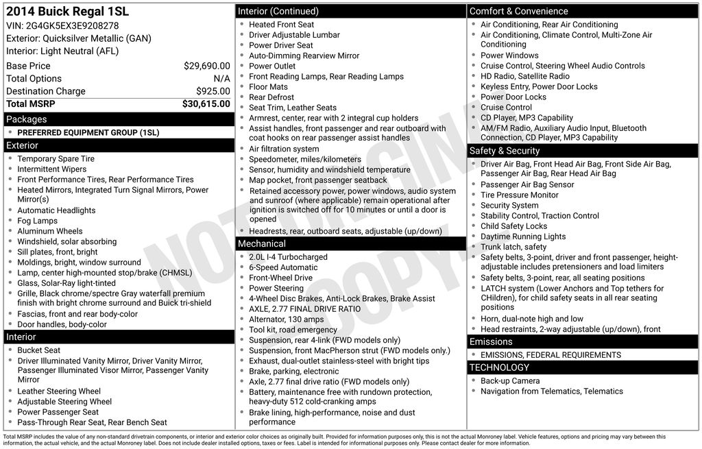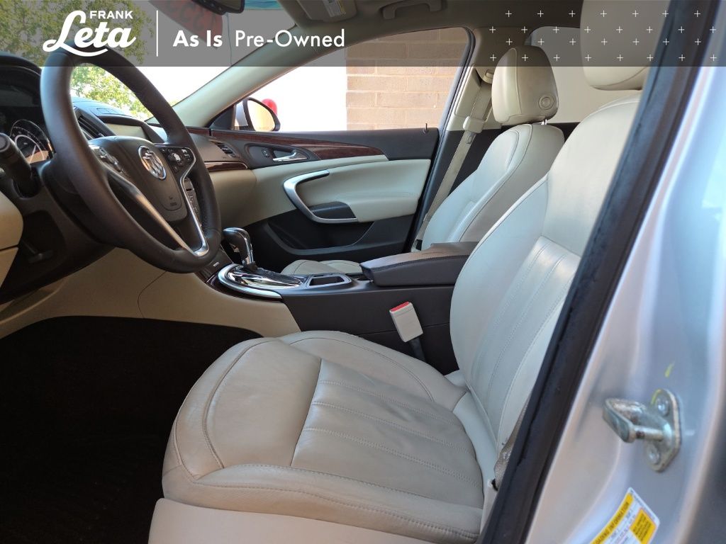 2014 Buick Regal Turbo Quicksilver Metallic Regal Turbo, 2.0L 4-Cylinder DGI DOHC VVT Turbocharged, 6-Speed Automatic, Quicksilver Metallic, Light Neutral Leather, 18" Alloy Wheels, Auto-dimming Rear-View mirror, Exterior Parking Camera Rear, Front dual zone A/C, Front fog lights, Fully automatic headlights, Heated front seats, 2-Way Adjustable Head Restraints, 4-Way Driver Power Lumbar, 4-Way Manual/2-Way Power Vertical Passenger Seat, 4-Wheel Disc Brakes, 7 Speakers, 7-Speaker Audio System Feature, 8-Way Power Driver Seat Adjuster, ABS brakes, Air Conditioning, AM/FM radio: SiriusXM, Automatic temperature control, Brake assist, Bumpers: body-color, CD player, Compass, Delay-off headlights, Driver door bin, Driver vanity mirror, Dual front impact airbags, Dual front side impact airbags, Electronic Stability Control, Emergency communication system: OnStar Directions & Connections, Four wheel independent suspension, Front anti-roll bar, Front Bucket Seats, Front Center Armrest, Front reading lights, Heated door mirrors, Heated Front Bucket Seats, Illuminated entry, Leather-Appointed Seat Trim, Low tire pressure warning, Occupant sensing airbag, Outside temperature display, Overhead airbag, Overhead console, Panic alarm, Passenger door bin, Passenger vanity mirror, Power door mirrors, Power driver seat, Power passenger seat, Power steering, Power windows, Premium audio system: IntelliLink, Radio data system, Radio: Buick IntelliLink AM/FM Stereo w/CD Player, Rear anti-roll bar, Rear reading lights, Rear seat center armrest, Rear window defroster, Regal 1SL, Remote keyless entry, Security system, SIRIUSXM Satellite Radio & HD Radio, Speed control, Split folding rear seat, Steering wheel mounted audio controls, Tachometer, Telescoping steering wheel, Tilt steering wheel, Traction control, Trip computer, Turn signal indicator mirrors, Variably intermittent wipers, Regal Turbo, 2.0L 4-Cylinder DGI DOHC VVT Turbocharged, 6-Speed Automatic, Quicksilver Metallic, Light Neutral Leather, 18" Alloy Wheels, Auto-dimming Rear-View mirror, Exterior Parking Camera Rear, Front dual zone A/C, Front fog lights, Fully automatic headlights, Heated front seats. 2.0L 4-Cylinder DGI DOHC VVT Turbocharged 6-Speed Automatic FWD 4D Sedan Odometer is 1970 miles below market average! 21/30 City/Highway MPG Awards: