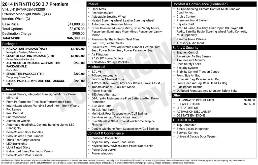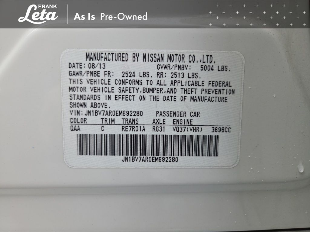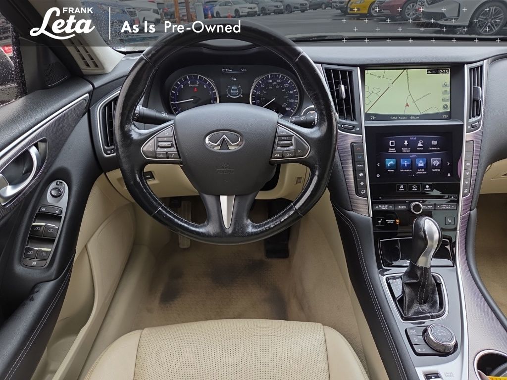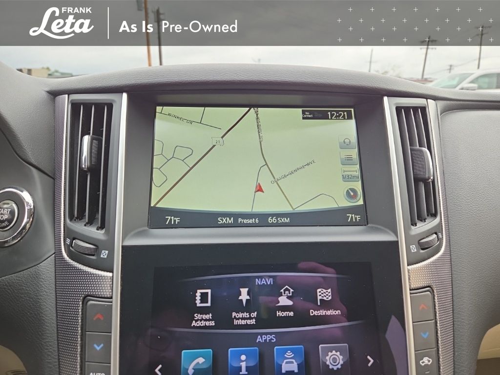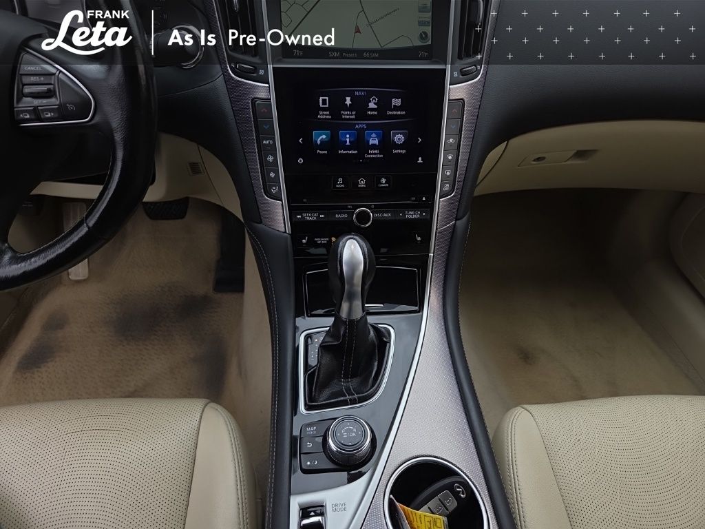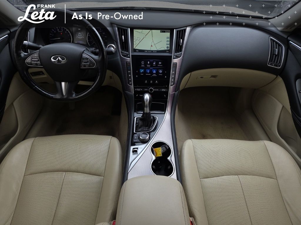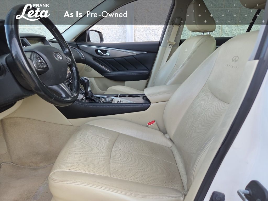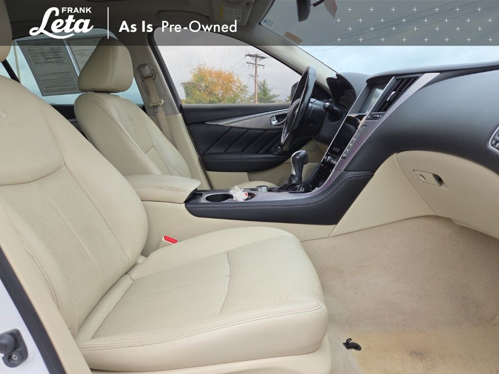 2014 INFINITI Q50 Premium Moonlight White Q50 Premium, 3.7L V6 DOHC 24V, AWD, Moonlight White, Wheat w/Premium Leatherette Seating Surfaces or Leather-Appointed Seats, 14 Speakers, 17" Aluminum Alloy Wheels, Auto-dimming Rear-View mirror, BOSE Centerpoint Simulated Surround, Front dual zone A/C, Front fog lights, Fully automatic headlights, Garage door transmitter: HomeLink, Heated Front Seats, Heated steering wheel, Navigation System, Power moonroof, 4-Wheel Disc Brakes, ABS brakes, Activation Disclaimer, Air Conditioning, AM/FM radio: SiriusXM, Anti-whiplash front head restraints, Automatic temperature control, Brake assist, Bumpers: body-color, Cargo Net, Cargo Package w/Spare Tire Package, CD player, Compass, Delay-off headlights, Driver door bin, Driver Seat 2-Way Power Lumbar, Driver vanity mirror, Dual front impact airbags, Dual front side impact airbags, Electronic Stability Control, First Aid Kit, Floor Mats, Four wheel independent suspension, Front anti-roll bar, Front Bucket Seats, Front Center Armrest, Front reading lights, Heated door mirrors, Heated front seats, Illuminated entry, Illuminated Kick Plates, INFINITI InTouch Navigation System, INFINITI Studio on Wheels by Bose, Jack Kit, Leather Seating Package, Leather Shift Knob, Leather steering wheel, Leather-Appointed Seats, Literature Kit, Low tire pressure warning, Navigation Package, Occupant sensing airbag, Outside temperature display, Overhead airbag, Overhead console, Panic alarm, Passenger door bin, Passenger vanity mirror, Power door mirrors, Power driver seat, Power passenger seat, Power steering, Power windows, Premium Leatherette Seating Surfaces, Radio data system, Radio: AM/FM/CD w/MP3 Playback Capability, Rear anti-roll bar, Rear reading lights, Rear seat center armrest, Rear window defroster, Remote keyless entry, Security system, Spare Tire Package, Speed control, Speed-sensing steering, Speed-Sensitive Wipers, Splash Guards, Steering wheel mounted audio controls, Tachometer, Telescoping steering wheel, Tilt steering wheel, Traction control, Trip computer, Trunk Mat, Turn signal indicator mirrors, Variably intermittent wipers, Q50 Premium, 3.7L V6 DOHC 24V, AWD, Moonlight White, Wheat w/Premium Leatherette Seating Surfaces or Leather-Appointed Seats, 14 Speakers, 17" Aluminum Alloy Wheels, Auto-dimming Rear-View mirror, BOSE Centerpoint Simulated Surround, Front dual zone A/C, Front fog lights, Fully automatic headlights, Garage door transmitter: HomeLink, Heated Front Seats, Heated steering wheel, Navigation System, Power moonroof. 3.7L V6 DOHC 24V 7-Speed Automatic with Manual Shift AWD 4D Sedan Odometer is 3048 miles below market average! 19/27 City/Highway MPG Awards: