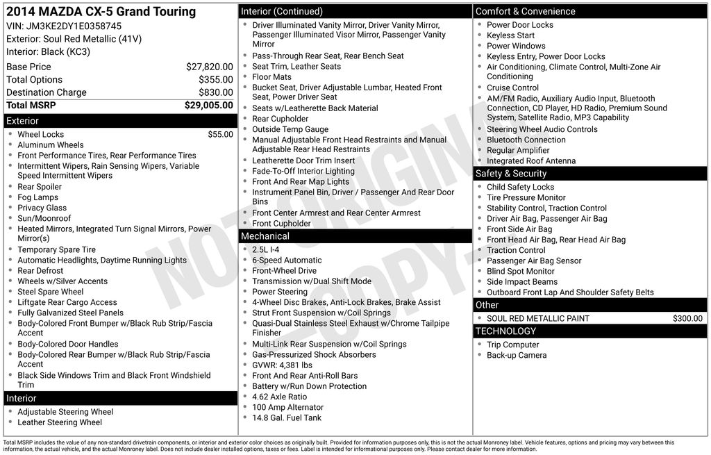 CARFAX One-Owner. 2014 Mazda CX-5 Grand Touring Soul Red Metallic Leather Seats, Grand Tour Package, Power moonroof, 19 x 7J Aluminum Alloy Wheels, 4-Wheel Disc Brakes, 4.62 Axle Ratio, 9 Speakers, ABS brakes, Air Conditioning, AM/FM radio: SIRIUS, Automatic temperature control, Brake assist, Bumpers: body-color, CD player, Delay-off headlights, Driver door bin, Driver vanity mirror, Dual front impact airbags, Dual front side impact airbags, Electronic Stability Control, Exterior Parking Camera Rear, Four wheel independent suspension, Front anti-roll bar, Front Bucket Seats, Front Center Armrest, Front dual zone A/C, Front fog lights, Front reading lights, Fully automatic headlights, Heated door mirrors, Heated front seats, Illuminated entry, Leather Seat Trim, Leather Shift Knob, Low tire pressure warning, Occupant sensing airbag, Outside temperature display, Overhead airbag, Overhead console, Panic alarm, Passenger door bin, Passenger vanity mirror, Power door mirrors, Power driver seat, Power steering, Power windows, Radio data system, Radio: AM/FM/CD/HD Modular Audio System w/Bose, Rain sensing wipers, Rear anti-roll bar, Rear reading lights, Rear seat center armrest, Rear window defroster, Rear window wiper, Remote keyless entry, Soul Red Metallic Paint, Speed control, Speed-sensing steering, Split folding rear seat, Spoiler, Steering wheel mounted audio controls, Tachometer, Telescoping steering wheel, Tilt steering wheel, Traction control, Trip computer, Turn signal indicator mirrors, Variable Heated Front Sport Shape Seats, Variably intermittent wipers, Wheel Locks, Power moonroof. SKYACTIV 2.5L 4-Cylinder DOHC 16V 6-Speed Automatic FWD 4D Sport Utility 25/32 City/Highway MPG Awards: