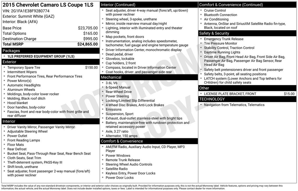 This 2015 Chevrolet Camaro 1LS is a true head-turner, boasting a sleek and sporty design that's sure to turn heads wherever you go. Under the hood, you'll find a powerful 3.6L V6 DGI DOHC VVT engine mated to a smooth-shifting 6-speed manual transmission, delivering an exhilarating driving experience. With a rear-wheel-drive configuration, this Camaro offers precise handling and responsive performance, making it a joy to pilot through twisting roads.