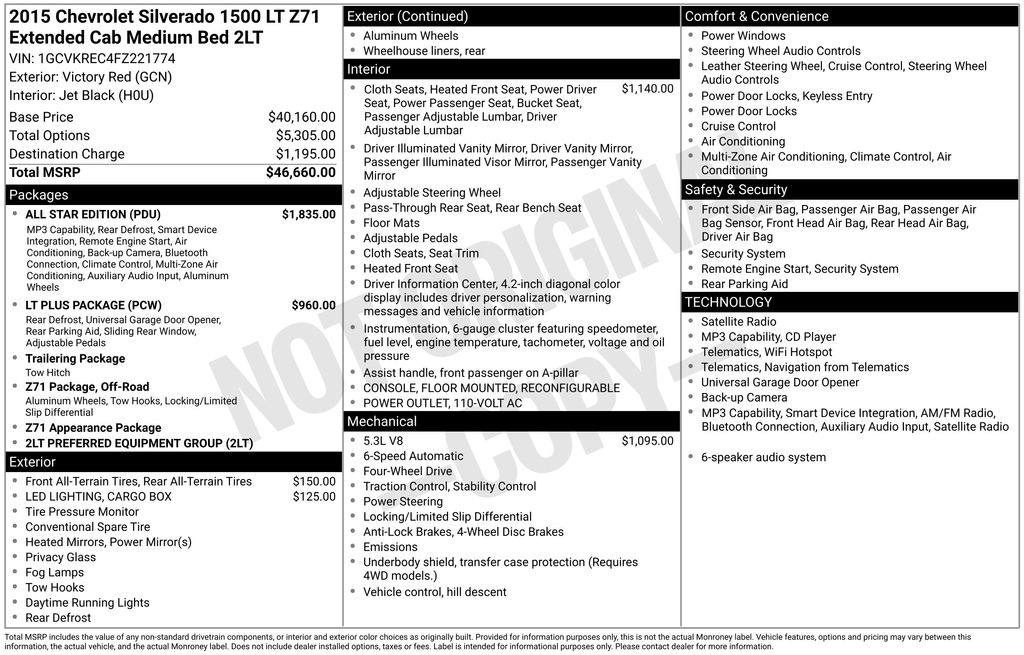 Recent Arrival! 2015 Chevrolet Silverado 1500 LT LT2 Victory Red 6-Speed Automatic Electronic with Overdrive, 4WD, Black Cloth, 10-Way Power Driver's Seat Adjuster, 110-Volt AC Power Outlet, 150 Amp Alternator, 4-Wheel Disc Brakes, 4.2" Diagonal Color Display Driver Info Center, 40/20/40 Front Split Bench Seat, 6 Speaker Audio System, 6 Speakers, ABS brakes, Air Conditioning, All Star Edition, Alloy wheels, AM/FM radio: SiriusXM, Auxiliary External Transmission Oil Cooler, Bluetooth For Phone, Body Color Bodyside Moldings, Body Color Door Handles, Body-Color Mirror Caps, Body-Color Power Adjustable Heated Outside Mirrors, Bodyside moldings, Brake assist, Bumpers: chrome, CD player, Cloth Seat Trim, Color-Keyed Carpeting w/Rubberized Vinyl Floor Mats, Compass, Deep-Tinted Glass, Delay-off headlights, Driver & Front Passenger Illuminated Vanity Mirrors, Driver door bin, Driver vanity mirror, Dual front impact airbags, Dual front side impact airbags, Dual-Zone Automatic Climate Control, Electric Rear-Window Defogger, Electronic Stability Control, Emergency communication system: OnStar Directions & Connections, EZ Lift & Lower Tailgate, Floor Mounted Console, Front anti-roll bar, Front Center Armrest w/Storage, Front Chrome Bumper, Front Halogen Fog Lamps, Front License Plate Kit, Front Power Reclining Bucket Seats, Front reading lights, Front wheel independent suspension, Fully automatic headlights, Heated door mirrors, Heated Driver & Front Passenger Seats, Heavy-Duty Rear Locking Differential, Illuminated entry, Leather Wrapped Steering Wheel w/Cruise Controls, LED Cargo Box Lighting, Low tire pressure warning, LT Plus Package, Manual Tilt Wheel Steering Column, Occupant sensing airbag, OnStar 6 Months Directions & Connections Plan, OnStar w/4G LTE, Outside temperature display, Overhead airbag, Overhead console, Panic alarm, Passenger door bin, Passenger vanity mirror, Power Adjustable Pedals, Power door mirrors, Power Sliding Rear Window w/Defogger, Power steering, Power windows, Power Windows w/Driver Express Up, Premium audio system: Chevrolet MyLink, Radio data system, Radio: AM/FM 8" Diagonal Color Touch Screen, Radio: AM/FM Audio System w/Chevrolet MyLink, Rear 60/40 Folding Bench Seat (Folds Up), Rear Chrome Bumper, Rear reading lights, Rear step bumper, Rear Vision Camera w/Dynamic Guide Lines, Rear Wheelhouse Liners, Remote Keyless Entry, Remote keyless entry, Remote Vehicle Starter System, Single Slot CD/MP3 Player, SiriusXM Satellite Radio, Speed control, Speed-sensing steering, Split folding rear seat, Steering Wheel Audio Controls, Steering wheel mounted audio controls, Tachometer, Theft Deterrent System (Unauthorized Entry), Tilt steering wheel, Traction control, Trailering Equipment, Trip computer, Ultrasonic Rear Park Assist, Universal Home Remote, Variably intermittent wipers, Voltmeter, Wheels: 17" x 8" Bright Machined Aluminum, 6-Speed Automatic Electronic with Overdrive, 4WD, Black Cloth. EcoTec3 5.3L V8 6-Speed Automatic Electronic with Overdrive 4WD 4D Double Cab