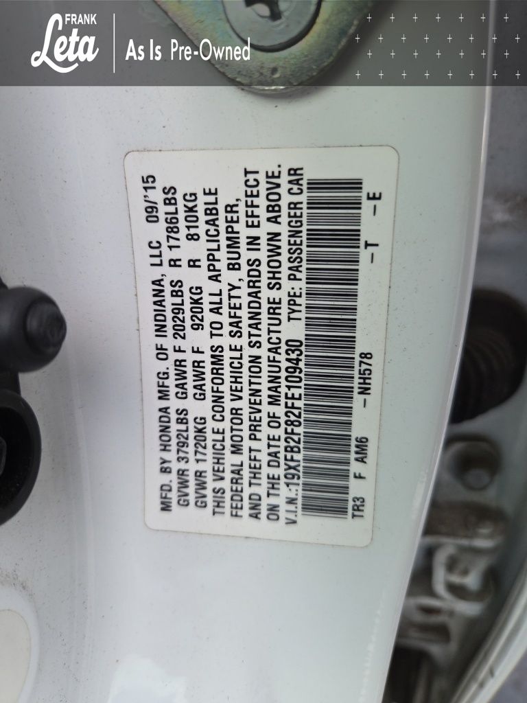 2015 Honda Civic EX Taffeta White Civic EX, 1.8L I4 SOHC 16V i-VTEC, Black w/Cloth Seat Trim, 16" Alloy Wheels, Exterior Parking Camera Rear, Fully automatic headlights, Power moonroof, 160-Watt AM/FM/CD Audio System, 4-Wheel Disc Brakes, 6 Speakers, ABS brakes, Air Conditioning, AM/FM radio, Automatic temperature control, Brake assist, Bumpers: body-color, CD player, Cloth Seat Trim, Delay-off headlights, Driver door bin, Driver vanity mirror, Dual front impact airbags, Dual front side impact airbags, Electronic Stability Control, Four wheel independent suspension, Front anti-roll bar, Front Bucket Seats, Front Center Armrest, Front reading lights, Illuminated entry, Low tire pressure warning, Occupant sensing airbag, Outside temperature display, Overhead airbag, Panic alarm, Passenger door bin, Passenger vanity mirror, Power door mirrors, Power steering, Power windows, Radio data system, Rear anti-roll bar, Rear seat center armrest, Rear window defroster, Reclining Front Bucket Seats, Remote keyless entry, Security system, Speed control, Speed-sensing steering, Split folding rear seat, Steering wheel mounted audio controls, Tachometer, Telescoping steering wheel, Tilt steering wheel, Traction control, Trip computer, Variably intermittent wipers, Civic EX, 1.8L I4 SOHC 16V i-VTEC, Black w/Cloth Seat Trim, 16" Alloy Wheels, Exterior Parking Camera Rear, Fully automatic headlights, Power moonroof. 1.8L I4 SOHC 16V i-VTEC CVT FWD 4D Sedan Odometer is 22987 miles below market average! 30/39 City/Highway MPG Awards: