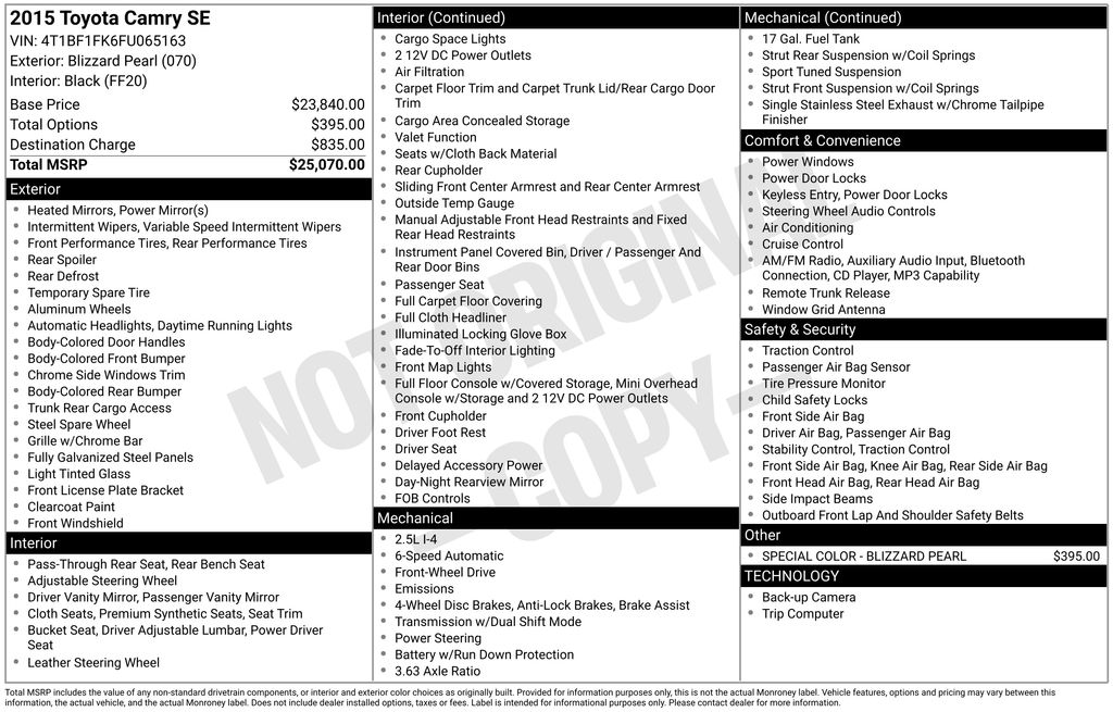 Recent Arrival! 2015 Toyota Camry SE Blizzard Pearl Black Cloth, 4-Wheel Disc Brakes, 6 Speakers, 7.0J x 17" Alloy Wheels, ABS brakes, Air Conditioning, Alloy wheels, AM/FM radio, Brake assist, Bumpers: body-color, CD player, Delay-off headlights, Driver door bin, Driver vanity mirror, Dual front impact airbags, Dual front side impact airbags, Electronic Stability Control, Exterior Parking Camera Rear, Four wheel independent suspension, Front anti-roll bar, Front Bucket Seats, Front Center Armrest, Front reading lights, Fully automatic headlights, Heated door mirrors, Illuminated entry, Knee airbag, Leather steering wheel, Low tire pressure warning, Occupant sensing airbag, Outside temperature display, Overhead airbag, Overhead console, Panic alarm, Passenger door bin, Passenger vanity mirror, Power door mirrors, Power driver seat, Power steering, Power windows, Radio: Entune Audio, Radio: Entune Audio Plus, Rear anti-roll bar, Rear seat center armrest, Rear side impact airbag, Rear window defroster, Remote keyless entry, Speed control, Speed-sensing steering, Split folding rear seat, Spoiler, Sport Fabric Softex-Trimmed Front Seat Trim, Sport steering wheel, Steering wheel mounted audio controls, Tachometer, Telescoping steering wheel, Tilt steering wheel, Traction control, Trip computer, Variably intermittent wipers, Black Cloth. 2.5L I4 SMPI DOHC 6-Speed Automatic FWD 4D Sedan Odometer is 70532 miles below market average! 25/35 City/Highway MPG Awards: