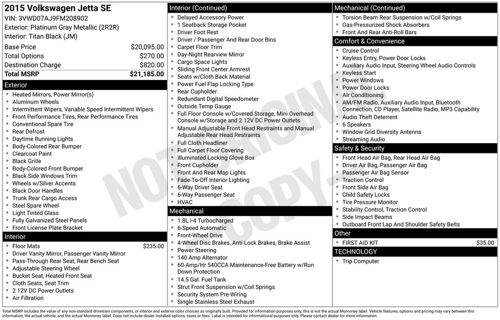 2015 Volkswagen Jetta 1.8T SE Platinum Gray Metallic Jetta 1.8T SE, 1.8L I4 DOHC Turbocharged, 6-Speed Automatic with Tiptronic, Platinum Gray Metallic, Cloth, 16" Alloy Wheels, Heated door mirrors, Heated Front Bucket Seats, 4-Wheel Disc Brakes, 6 Speakers, ABS brakes, Air Conditioning, AM/FM radio: SiriusXM, Brake assist, Bumpers: body-color, CD player, Cloth Seat Trim, Driver door bin, Driver vanity mirror, Dual front impact airbags, Dual front side impact airbags, Electronic Stability Control, Front anti-roll bar, Front Bucket Seats, Front Center Armrest, Front reading lights, Front wheel independent suspension, Heated front seats, Illuminated entry, Low tire pressure warning, Occupant sensing airbag, Outside temperature display, Overhead airbag, Overhead console, Panic alarm, Passenger door bin, Passenger vanity mirror, Power door mirrors, Power steering, Power windows, Radio data system, Radio: RCD 310 w/Single CD, Rear anti-roll bar, Rear reading lights, Rear window defroster, Remote keyless entry, Speed control, Speed-sensing steering, Split folding rear seat, Steering wheel mounted audio controls, Tachometer, Telescoping steering wheel, Tilt steering wheel, Traction control, Trip computer, Variably intermittent wipers, Jetta 1.8T SE, 1.8L I4 DOHC Turbocharged, 6-Speed Automatic with Tiptronic, Platinum Gray Metallic, Cloth, 16" Alloy Wheels, Heated door mirrors, Heated Front Bucket Seats. 1.8L I4 DOHC Turbocharged 6-Speed Automatic with Tiptronic FWD 4D Sedan 25/37 City/Highway MPG