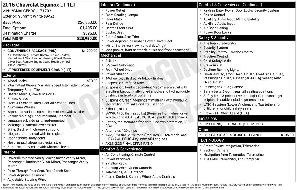 2016 Chevrolet Equinox LT Summit White Equinox LT, 2.4L 4-Cylinder SIDI DOHC VVT, 6-Speed Automatic with Overdrive, FWD, Summit White, Jet Black Cloth, 17" Aluminum Wheels, Bluetooth For Phone, Exterior Parking Camera Rear, Fully automatic headlights, Heated Driver & Front Passenger Seats, 3.23 Axle Ratio, 4-Wheel Disc Brakes, 6 Speaker Audio System Feature, 6 Speakers, 8-Way Power Driver Seat Adjuster, ABS brakes, Air Conditioning, Air Conditioning w/Automatic Climate Control, AM/FM radio: SiriusXM, Brake assist, Bumpers: body-color, Cargo Area Close-Out Panel (LPO), Compass, Convenience Package, Delay-off headlights, Deluxe Front Bucket Seats, Driver door bin, Driver vanity mirror, Dual front impact airbags, Dual front side impact airbags, E10 Fuel Capable, Electronic Stability Control, Emergency communication system: OnStar Guidance, Equipment Group 1LT, Four wheel independent suspension, Front anti-roll bar, Front Bucket Seats, Front Center Armrest, Front reading lights, Heated door mirrors, Illuminated entry, Leather-Wrapped Steering Wheel w/Audio/Cruise Ctrls, Low tire pressure warning, Manual Climate Control, Occupant sensing airbag, Outside temperature display, Overhead airbag, Panic alarm, Passenger door bin, Passenger vanity mirror, Power door mirrors, Power driver seat, Power steering, Power windows, Premium audio system: Chevrolet MyLink, Premium Cloth Seat Trim, Radio data system, Radio: Chevrolet MyLink Audio System, Rear anti-roll bar, Rear seat center armrest, Rear window defroster, Rear window wiper, Remote keyless entry, Remote Vehicle Starter System, Roof rack: rails only, Security system, SiriusXM Satellite Radio, Speed control, Speed-sensing steering, Split folding rear seat, Spoiler, Steering wheel mounted audio controls, Tachometer, Telescoping steering wheel, Tilt steering wheel, Traction control, Trip computer, Variably intermittent wipers, Equinox LT, 2.4L 4-Cylinder SIDI DOHC VVT, 6-Speed Automatic with Overdrive, FWD, Summit White, Jet Black Cloth, 17" Aluminum Wheels, Bluetooth For Phone, Exterior Parking Camera Rear, Fully automatic headlights, Heated Driver & Front Passenger Seats. 2.4L 4-Cylinder SIDI DOHC VVT 6-Speed Automatic with Overdrive FWD 4D Sport Utility 22/32 City/Highway MPG Awards: