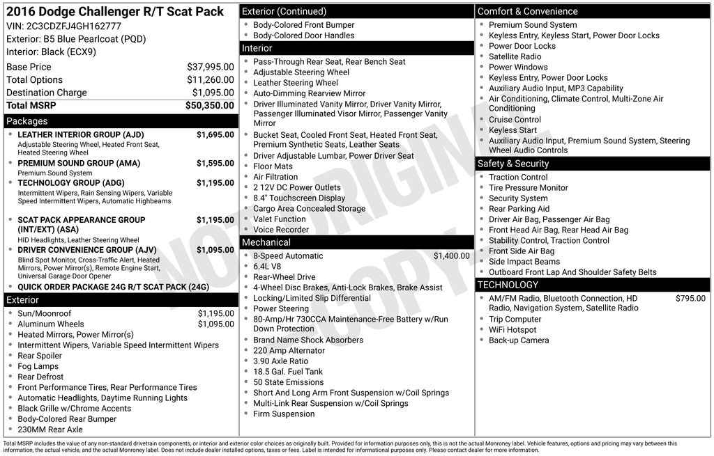 2016 Dodge Challenger R/T Scat Pack B5 Blue Pearlcoat Challenger R/T Scat Pack, SRT HEMI 6.4L V8 MDS, B5 Blue Pearlcoat, 18 Speakers Premium Audio System, 5-Year SiriusXM Traffic Service, 5-Year SiriusXM Travel Link Service, 8.4" Touchscreen Display, Auto-dimming Rear-View mirror, Front dual zone A/C, Front fog lights, Fully automatic headlights, GPS Navigation, harman/kardon GreenEdge Amp, HD Radio, Heated Front Seats, Heated Steering Wheel, Integrated Voice Command w/Bluetooth, Leather Trim Seats, Media Hub (SD, USB, AUX Ports), ParkView Rear Back-Up Camera, Power Sunroof, Radio: Uconnect 8.4 NAV, Remote Start System, SiriusXM Satellite Radio, SiriusXM Traffic, SiriusXM Travel Link, Suede/Nappa Performance Seats w/R/T Logo, Uconnect Access, Ventilated Front Seats, Wheels: 20" x 9.0" Forged/Painted Aluminum, 230MM Rear Axle, 3.09 Rear Axle Ratio, 4-Wheel Disc Brakes, 6 Speakers, ABS brakes, Air Conditioning, AM/FM radio: SiriusXM, Anti-whiplash front head restraints, Automatic temperature control, Brake assist, Bumpers: body-color, Compass, Delay-off headlights, Driver Convenience Group, Driver door bin, Driver vanity mirror, Dual front impact airbags, Dual front side impact airbags, Electronic Stability Control, Emergency communication system: Uconnect Access, Four wheel independent suspension, Front anti-roll bar, Front Bucket Seats, Front Center Armrest, Front reading lights, Heated door mirrors, Hectic Mesh Interior Accents, Illuminated entry, Instrument Panel Satin Silver Bezel, Leather Interior Group, Leather Shift Knob, Low tire pressure warning, Outside temperature display, Overhead airbag, Overhead console, Panic alarm, Passenger door bin, Passenger vanity mirror, Power door mirrors, Power driver seat, Power steering, Power Tilt/Telescope Steering Column, Power windows, Premium Sound Group, Quick Order Package 24G R/T Scat Pack, Radio data system, Radio: Uconnect 8.4, Rear anti-roll bar, Rear reading lights, Rear seat center armrest, Rear window defroster, Remote keyless entry, Scat Pack Appearance Group (Int/Ext), Security system, Speed control, Speed-sensing steering, Split folding rear seat, Spoiler, Steering wheel mounted audio controls, Tachometer, Technology Group, Telescoping steering wheel, Tilt steering wheel, Traction control, Trip computer, Variably intermittent wipers, Challenger R/T Scat Pack, SRT HEMI 6.4L V8 MDS, B5 Blue Pearlcoat, 18 Speakers Premium Audio System, 5-Year SiriusXM Traffic Service, 5-Year SiriusXM Travel Link Service, 8.4" Touchscreen Display, Auto-dimming Rear-View mirror, Front dual zone A/C, Front fog lights, Fully automatic headlights, GPS Navigation, harman/kardon GreenEdge Amp, HD Radio, Heated Front Seats, Heated Steering Wheel, Integrated Voice Command w/Bluetooth, Leather Trim Seats, Media Hub (SD, USB, AUX Ports), ParkView Rear Back-Up Camera, Power Sunroof, Radio: Uconnect 8.4 NAV, Remote Start System, SiriusXM Satellite Radio, SiriusXM Traffic, SiriusXM Travel Link, Suede/Nappa Performance Seats w/R/T Logo, Uconnect Access, Ventilated Front Seats, Wheels: 20" x 9.0" Forged/Painted Aluminum. SRT HEMI 6.4L V8 MDS 8-Speed Automatic RWD 2D Coupe