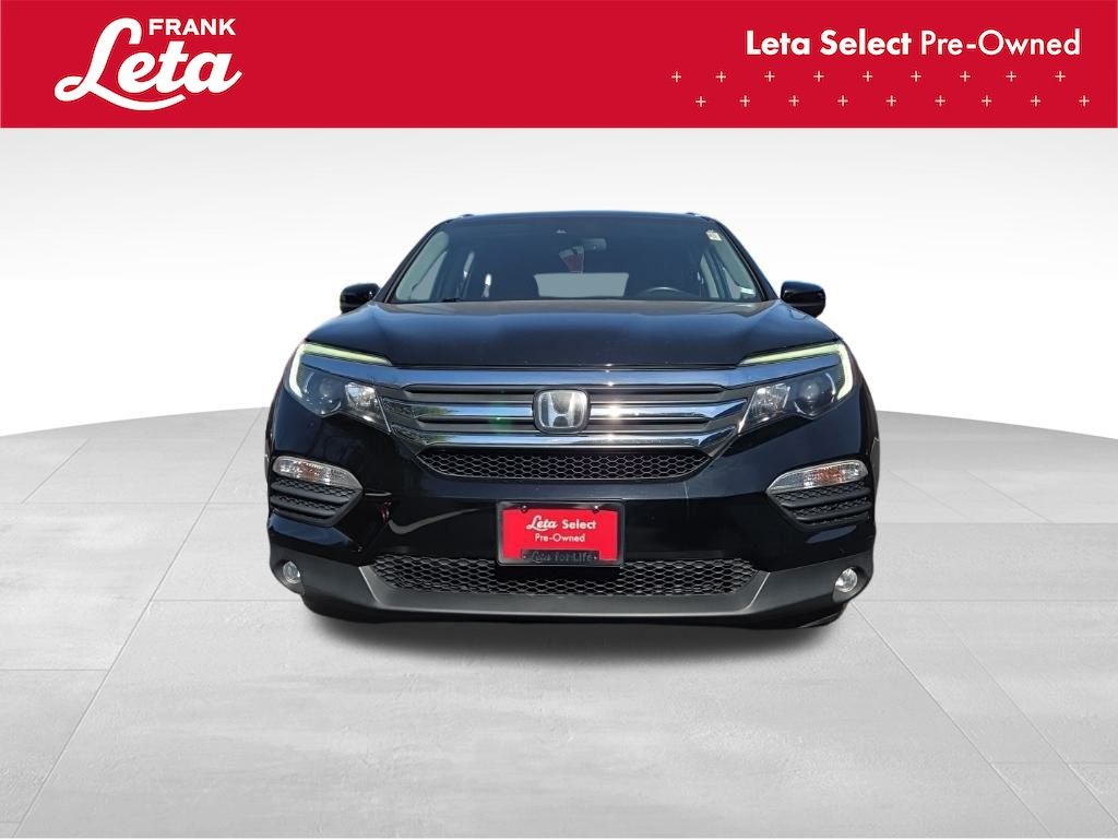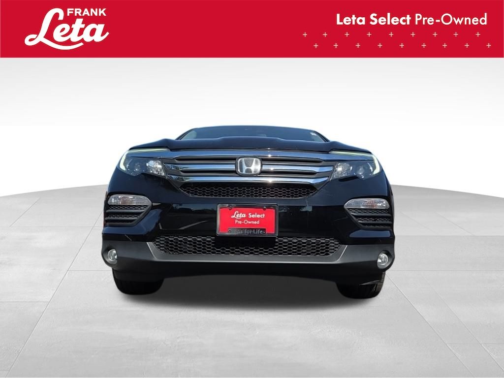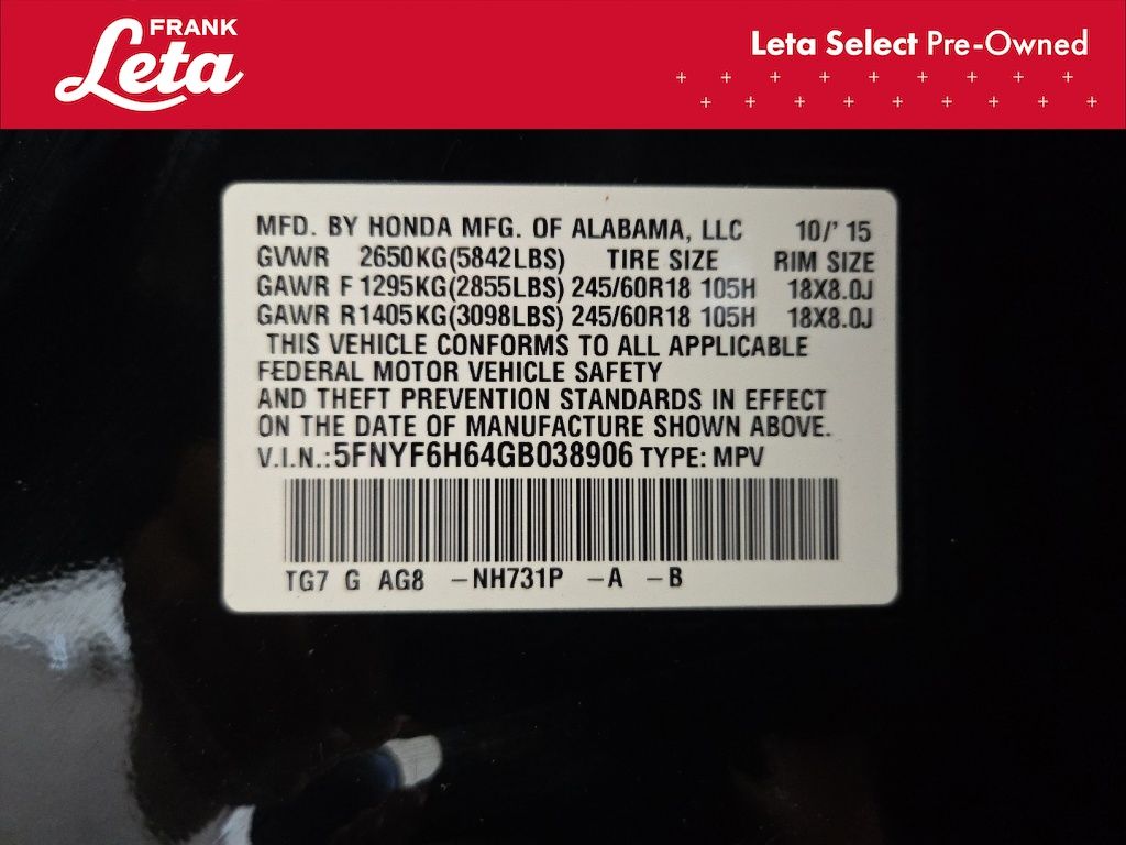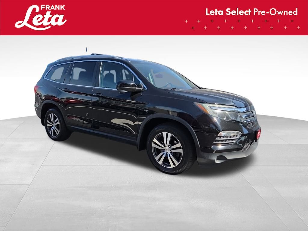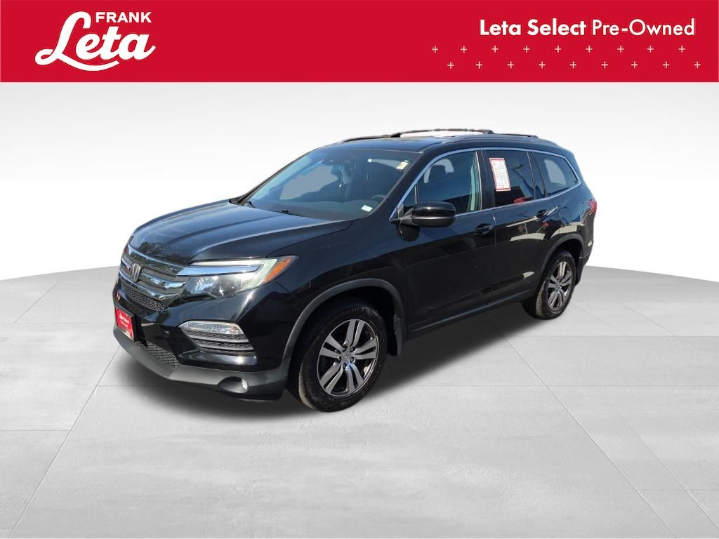 CARFAX One-Owner. 2016 Honda Pilot EX-L w/Honda Sensing Crystal Black Pearl Pilot EX-L w/Honda Sensing, Frank Leta Select Certified, 3.5L V6 24V SOHC i-VTEC, AWD, Crystal Black Pearl, Black w/Leather-Trimmed Seats, 18" Alloy Wheels, 3rd row seats: split-bench, Auto-dimming Rear-View mirror, Exterior Parking Camera Rear, Front fog lights, Fully automatic headlights, Garage door transmitter: HomeLink, Heated front seats, Leather-Trimmed Seats, Power Liftgate, Power moonroof, Trip computer, 4-Wheel Disc Brakes, 4.25 Axle Ratio, 7 Speakers, ABS brakes, Air Conditioning, AM/FM radio: SiriusXM, Auto High-beam Headlights, Automatic temperature control, Brake assist, Bumpers: body-color, Compass, Delay-off headlights, Driver door bin, Driver vanity mirror, Dual front impact airbags, Dual front side impact airbags, Electronic Stability Control, Emergency communication system: HondaLink Assist, Four wheel independent suspension, Front anti-roll bar, Front Bucket Seats, Front Center Armrest, Front dual zone A/C, Front reading lights, Heated door mirrors, Heated Front Bucket Seats, Illuminated entry, Leather Shift Knob, Low tire pressure warning, Occupant sensing airbag, Outside temperature display, Overhead airbag, Overhead console, Panic alarm, Passenger door bin, Passenger vanity mirror, Power door mirrors, Power driver seat, Power passenger seat, Power steering, Power windows, Radio data system, Radio: AM/FM Audio System, Rear air conditioning, Rear anti-roll bar, Rear reading lights, Rear seat center armrest, Rear window defroster, Rear window wiper, Remote keyless entry, Security system, SiriusXM Radio, Speed control, Speed-sensing steering, Speed-Sensitive Wipers, Split folding rear seat, Spoiler, Steering wheel mounted audio controls, Tachometer, Telescoping steering wheel, Tilt steering wheel, Traction control, Variably intermittent wipers, Pilot EX-L w/Honda Sensing, 3.5L V6 24V SOHC i-VTEC, AWD, Crystal Black Pearl, Black w/Leather-Trimmed Seats, 18" Alloy Wheels, 3rd row seats: split-bench, Auto-dimming Rear-View mirror, Exterior Parking Camera Rear, Front fog lights, Fully automatic headlights, Garage door transmitter: HomeLink, Heated front seats, Leather-Trimmed Seats, Power Liftgate, Power moonroof, Trip computer. 3.5L V6 24V SOHC i-VTEC 6-Speed Automatic AWD 4D Sport Utility Odometer is 9723 miles below market average! 18/26 City/Highway MPG Awards: