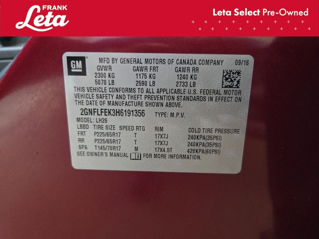 2017 Chevrolet Equinox LT Siren Red Tintcoat Equinox LT, Frank Leta Select Certified, 2.4L 4-Cylinder SIDI DOHC VVT, AWD, Siren Red Tintcoat, Jet Black Cloth, 17" Aluminum Wheels, Bluetooth For Phone, Exterior Parking Camera Rear, Fully automatic headlights, 3.53 Axle Ratio, 4-Wheel Disc Brakes, 6 Speakers, ABS brakes, Air Conditioning, All-Weather Floor Mats, AM/FM radio: SiriusXM, Brake assist, Bumpers: body-color, Cargo Area Close-Out Panel (LPO), Compass, Delay-off headlights, Deluxe Front Bucket Seats, Driver door bin, Driver vanity mirror, Dual front impact airbags, Dual front side impact airbags, E10 Fuel Capable, E85 FlexFuel Capable, Electronic Stability Control, Emergency communication system: OnStar Guidance, Four wheel independent suspension, Front anti-roll bar, Front Bucket Seats, Front Center Armrest, Front reading lights, Heated door mirrors, Illuminated entry, Leather-Wrapped Steering Wheel w/Audio/Cruise Ctrls, Low tire pressure warning, Manual Climate Control, Molded Splash Guards, Occupant sensing airbag, Outside temperature display, Overhead airbag, Panic alarm, Passenger door bin, Passenger vanity mirror, Power door mirrors, Power driver seat, Power steering, Power windows, Premium audio system: Chevrolet MyLink, Premium Cloth Seat Trim, Protection Package, Radio data system, Radio: Chevrolet MyLink Audio System, Rear anti-roll bar, Rear seat center armrest, Rear window defroster, Rear window wiper, Remote keyless entry, Roof rack: rails only, Security system, SiriusXM Satellite Radio, Speed control, Speed-sensing steering, Split folding rear seat, Spoiler, Steering wheel mounted audio controls, Tachometer, Telescoping steering wheel, Tilt steering wheel, Traction control, Trip computer, Variably intermittent wipers, Equinox LT, 2.4L 4-Cylinder SIDI DOHC VVT, AWD, Siren Red Tintcoat, Jet Black Cloth, 17" Aluminum Wheels, Bluetooth For Phone, Exterior Parking Camera Rear, Fully automatic headlights. 2.4L 4-Cylinder SIDI DOHC VVT 6-Speed Automatic with Overdrive AWD 4D Sport Utility Odometer is 49021 miles below market average! 20/28 City/Highway MPG Awards: