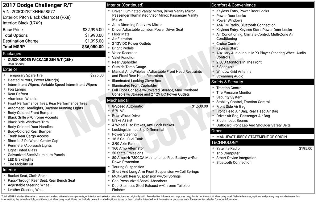 Recent Arrival! 2017 Dodge Challenger R/T Pitch Black Clearcoat 4-Wheel Disc Brakes, 6 Speakers, ABS brakes, Air Conditioning, Alloy wheels, AM/FM radio, Anti-Lock Brakes, Anti-whiplash front head restraints, Auto-dimming Rear-View mirror, Automatic temperature control, Brake assist, Bright Pedals, Bumpers: body-color, Compass, Delay-off headlights, Driver door bin, Driver vanity mirror, Dual front impact airbags, Dual front side impact airbags, Electronic Stability Control, Four wheel independent suspension, Front anti-roll bar, Front Bucket Seats, Front Center Armrest, Front dual zone A/C, Front fog lights, Front reading lights, Fully automatic headlights, Heated door mirrors, Houndstooth Cloth Sport Seats, Illuminated entry, Integrated Voice Command w/Bluetooth, Leather Shift Knob, Low tire pressure warning, Outside temperature display, Overhead airbag, Overhead console, Panic alarm, Passenger door bin, Passenger vanity mirror, Power door mirrors, Power driver seat, Power steering, Power windows, Quick Order Package 28H R/T, Radio data system, Radio: Uconnect 3 w/5" Display, Rear anti-roll bar, Rear reading lights, Rear seat center armrest, Rear window defroster, Remote keyless entry, Rhombi 2-Pc Wheel Center Cap, Security system, SiriusXM Satellite Radio, Speed control, Speed-sensing steering, Split folding rear seat, Spoiler, Steering wheel mounted audio controls, Tachometer, Telescoping steering wheel, Tilt steering wheel, Traction control, Trip computer, Variably intermittent wipers, Wheels: 20" x 8.0" Premium Painted Aluminum. HEMI 5.7L V8 Multi Displacement VVT 8-Speed Automatic RWD 2D Coupe