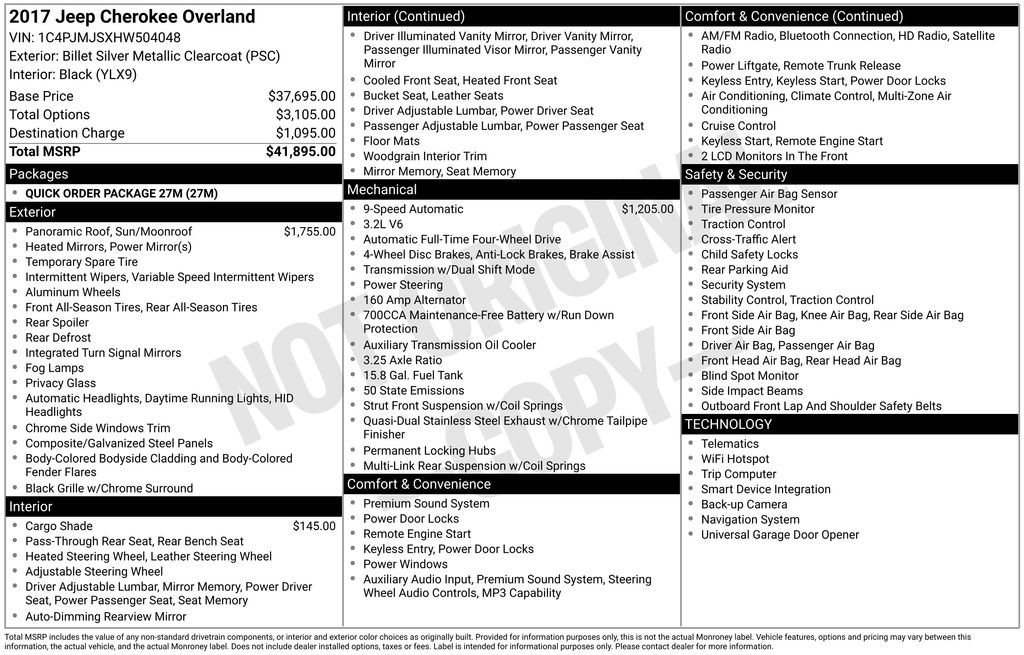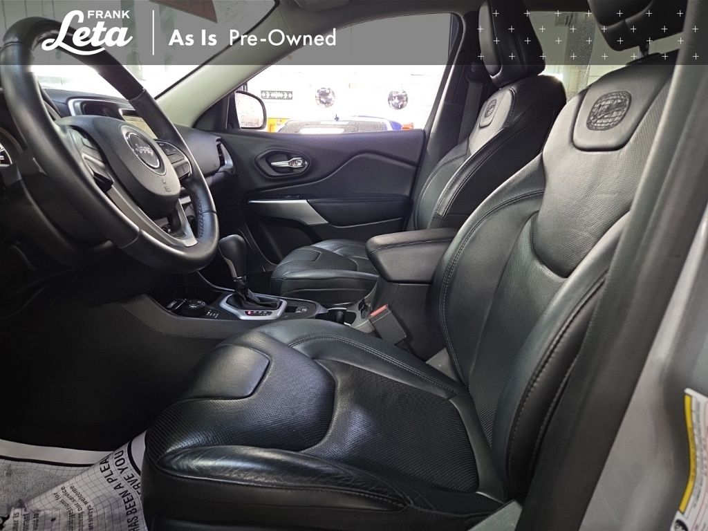 2017 Jeep Cherokee Overland Billet Silver Metallic Clearcoat Cherokee Overland, 3.2L V6, 4WD, Billet Silver Metallic Clearcoat, Black w/Premium Leather Trimmed Bucket Seats, 10 Speakers, Auto-dimming Rear-View mirror, Front dual zone A/C, Front fog lights, Fully automatic headlights, Garage door transmitter, Heated front seats, Heated steering wheel, High intensity discharge headlights: Bi-Xenon, Memory seat, Navigation System, ParkView Rear Back-Up Camera, Power Front/Fixed Rear Full Sunroof, Power Liftgate, Ventilated front seats, Wheels: 18" x 7" Polished Aluminum, 4-Wheel Disc Brakes, ABS brakes, Air Conditioning, AM/FM radio: SiriusXM, Anti-whiplash front head restraints, Audio memory, Automatic temperature control, Auxiliary Transmission Oil Cooler, Brake assist, Bumpers: body-color, Compass, Delay-off headlights, Driver door bin, Driver vanity mirror, Dual front impact airbags, Dual front side impact airbags, Electronic Stability Control, Emergency communication system: Uconnect Access, Exterior Mirrors Courtesy Lamps, Exterior Mirrors w/Supplemental Signals, Four wheel independent suspension, Front anti-roll bar, Front Bucket Seats, Front Center Armrest, Front reading lights, Heated door mirrors, Illuminated entry, Knee airbag, Leather Shift Knob, Leather steering wheel, Low tire pressure warning, Occupant sensing airbag, Off Road Suspension, Outside temperature display, Overhead airbag, Overhead console, Panic alarm, Passenger door bin, Passenger vanity mirror, Power door mirrors, Power driver seat, Power passenger seat, Power steering, Power windows, Premium Leather Trimmed Bucket Seats, Quick Order Package 27M, Radio data system, Radio: Uconnect 3C Nav w/8.4" Display, Rear anti-roll bar, Rear reading lights, Rear seat center armrest, Rear side impact airbag, Rear window defroster, Rear window wiper, Remote keyless entry, Roof rack: rails only, Security system, Speed control, Speed-sensing steering, Split folding rear seat, Spoiler, Steering wheel mounted audio controls, Tachometer, Telescoping steering wheel, Tilt steering wheel, Tonneau Cover, Traction control, Trip computer, Turn signal indicator mirrors, Variably intermittent wipers, Voltmeter, Cherokee Overland, 3.2L V6, 4WD, Billet Silver Metallic Clearcoat, Black w/Premium Leather Trimmed Bucket Seats, 10 Speakers, Auto-dimming Rear-View mirror, Front dual zone A/C, Front fog lights, Fully automatic headlights, Garage door transmitter, Heated front seats, Heated steering wheel, High intensity discharge headlights: Bi-Xenon, Memory seat, Navigation System, ParkView Rear Back-Up Camera, Power Front/Fixed Rear Full Sunroof, Power Liftgate, Ventilated front seats, Wheels: 18" x 7" Polished Aluminum. 3.2L V6 9-Speed 948TE Automatic 4WD 4D Sport Utility Odometer is 14773 miles below market average! 20/27 City/Highway MPG Awards:
