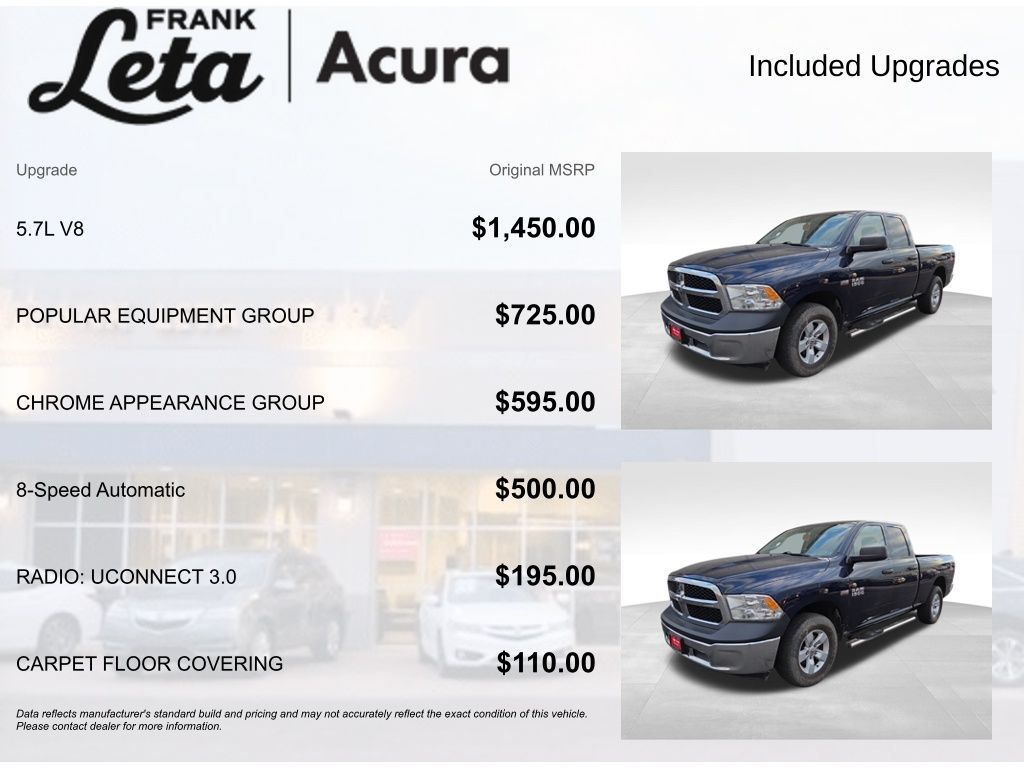 2017 Ram 1500 Tradesman True Blue Pearlcoat 1500 Tradesman, Frank Leta Select Certified, HEMI 5.7L V8 Multi Displacement VVT, 4WD, True Blue Pearlcoat, 17" x 7" Aluminum Wheels, Fully automatic headlights, Heated door mirrors, Integrated Voice Command w/Bluetooth, 1-Year SiriusXM Radio Service, 3.21 Rear Axle Ratio, 4-Wheel Disc Brakes, 40/20/40 Split Bench Seat, 6 Speakers, ABS brakes, Active Grille Shutters, Air Conditioning, AM/FM radio, Audio Jack Input for Mobile Devices, Black Exterior Mirrors, Brake assist, Bright Front Bumper, Bright Grille, Bright Rear Bumper, Carpet Floor Covering, Chrome Appearance Group, Cloth 40/20/40 Bench Seat, Delay-off headlights, Driver door bin, Dual front impact airbags, Dual front side impact airbags, Electronic Shift, Electronic Stability Control, Exterior Mirrors w/Heating Element, Front anti-roll bar, Front Armrest w/3 Cupholders, Front Center Armrest, Front wheel independent suspension, Heavy Duty Vinyl 40/20/40 Split Bench Seat, Low tire pressure warning, Media Hub (USB, AUX), Occupant sensing airbag, Overhead airbag, Passenger door bin, Popular Equipment Group, Power door mirrors, Power steering, Power windows, Quick Order Package 27B Tradesman, Radio data system, Radio: 3.0, Radio: Uconnect 3.0, Rear anti-roll bar, Rear Folding Seat, Rear step bumper, Remote Keyless Entry w/All-Secure, Remote USB Port, Rotary Shifter-Black, SiriusXM Satellite Radio, Speed control, Tachometer, Tilt steering wheel, Tip Start, Traction control, Tradesman Package, Variably intermittent wipers, Voltmeter, 1500 Tradesman, HEMI 5.7L V8 Multi Displacement VVT, 4WD, True Blue Pearlcoat, 17" x 7" Aluminum Wheels, Fully automatic headlights, Heated door mirrors, Integrated Voice Command w/Bluetooth. HEMI 5.7L V8 Multi Displacement VVT 8-Speed Automatic 4WD 4D Quad Cab Odometer is 53934 miles below market average!