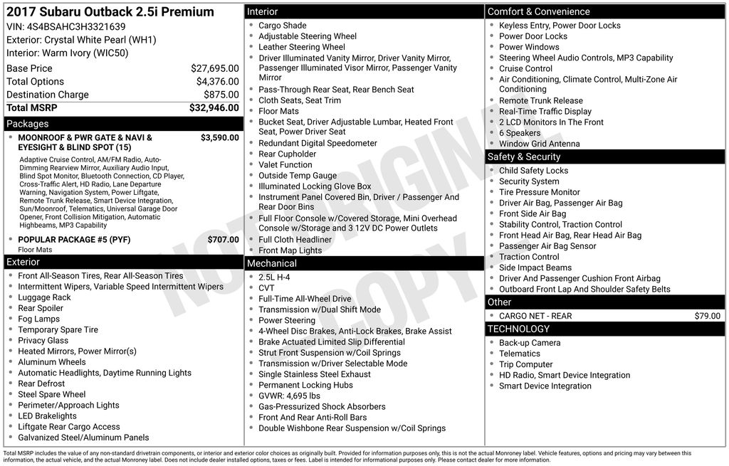 - Moonroof & Pwr Gate & Navi & EyeSight & Blind Spot