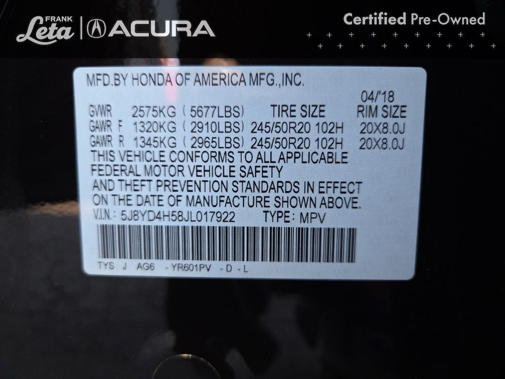 2018 Acura MDX 3.5L SH-AWD w/Technology Package Black Copper Pearl MDX 3.5L SH-AWD w/Technology Package, Precision Used Certified, 3.5L V6 SOHC i-VTEC 24V, AWD, Black Copper Pearl, Espresso w/Leather-Trimmed Interior, 10 Speakers, 3rd row seats: bench, Apple CarPlay/Android Auto, Auto tilt-away steering wheel, Auto-dimming Rear-View mirror, Exterior Parking Camera Rear, Front dual zone A/C, Garage door transmitter: HomeLink, Heated door mirrors, Heated front seats, Lane Departure Warning System, Memory seat, Navigation System, Power Liftgate, Power moonroof, Radio: Acura/ELS Studio Premium Audio System, Rear air conditioning, Wheels: 20" x 8" Pewter Gray Metallic 10-Spoke, 4-Wheel Disc Brakes, 4.33 Axle Ratio, ABS brakes, Adaptive suspension, Air Conditioning, AM/FM radio: SiriusXM, Anti-whiplash front head restraints, Audio memory, Auto High-beam Headlights, Automatic temperature control, Brake assist, Bumpers: body-color, CD player, Compass, Delay-off headlights, Driver door bin, Driver vanity mirror, Dual front impact airbags, Dual front side impact airbags, Electronic Stability Control, Emergency communication system: AcuraLink, Four wheel independent suspension, Front anti-roll bar, Front Bucket Seats, Front Center Armrest, Front reading lights, Heated Front Sport Seats, HVAC memory, Illuminated entry, Knee airbag, Leather steering wheel, Leather-Trimmed Interior, Low tire pressure warning, Occupant sensing airbag, Outside temperature display, Overhead airbag, Overhead console, Panic alarm, Passenger door bin, Passenger vanity mirror, Power door mirrors, Power driver seat, Power passenger seat, Power steering, Power windows, Premium audio system: Acura/ELS Surround, Radio data system, Rain sensing wipers, Rear anti-roll bar, Rear reading lights, Rear seat center armrest, Rear window defroster, Rear window wiper, Remote keyless entry, Security system, Speed control, Speed-sensing steering, Speed-Sensitive Wipers, Split folding rear seat, Spoiler, Steering wheel memory, Steering wheel mounted audio controls, Tachometer, Telescoping steering wheel, Tilt steering wheel, Traction control, Trip computer, Turn signal indicator mirrors, Variably intermittent wipers, MDX 3.5L SH-AWD w/Technology Package, 3.5L V6 SOHC i-VTEC 24V, AWD, Black Copper Pearl, Espresso w/Leather-Trimmed Interior, 10 Speakers, 3rd row seats: bench, Apple CarPlay/Android Auto, Auto tilt-away steering wheel, Auto-dimming Rear-View mirror, Exterior Parking Camera Rear, Front dual zone A/C, Garage door transmitter: HomeLink, Heated door mirrors, Heated front seats, Lane Departure Warning System, Memory seat, Navigation System, Power Liftgate, Power moonroof, Radio: Acura/ELS Studio Premium Audio System, Rear air conditioning, Wheels: 20" x 8" Pewter Gray Metallic 10-Spoke. 3.5L V6 SOHC i-VTEC 24V 9-Speed Automatic AWD 4D Sport Utility 18/26 City/Highway MPG Awards: