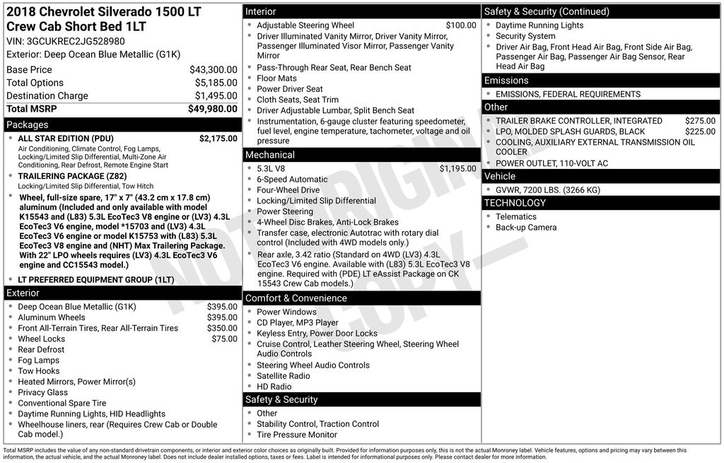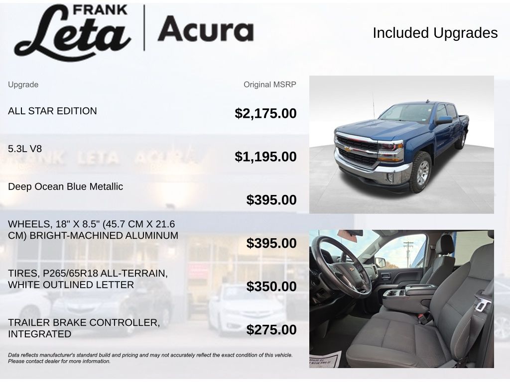 2018 Chevrolet Silverado 1500 LT LT1 Deep Ocean Blue Metallic Silverado 1500 LT LT1, EcoTec3 5.3L V8, 6-Speed Automatic Electronic with Overdrive, 4WD, Deep Ocean Blue Metallic, Black Cloth, Bluetooth For Phone, Dual-Zone Automatic Climate Control, Exterior Parking Camera Rear, Fully automatic headlights, Heavy-Duty Rear Locking Differential, High-Intensity Discharge Headlights, Remote Vehicle Starter System, Theft Deterrent System (Unauthorized Entry), 10-Way Power Driver's Seat Adjuster, 110-Volt AC Power Outlet, 150 Amp Alternator, 4-Wheel Disc Brakes, 4.2" Diagonal Color Display Driver Info Center, 40/20/40 Front Split Bench Seat, 6 Speaker Audio System, 6 Speakers, ABS brakes, Air Conditioning, All Star Edition, Alloy wheels, AM/FM radio: SiriusXM, Auxiliary External Transmission Oil Cooler, Body Color Bodyside Moldings, Body-Color Door Handles, Body-Color Mirror Caps, Body-Color Power Adjustable Heated Outside Mirrors, Bodyside moldings, Brake assist, CD player, Chevrolet Connected Access, Chevrolet w/4G LTE, Cloth Seat Trim, Color-Keyed Carpeting w/Rubberized Vinyl Floor Mats, Compass, Deep-Tinted Glass, Delay-off headlights, Driver & Front Passenger Illuminated Vanity Mirrors, Driver door bin, Driver vanity mirror, Dual front impact airbags, Dual front side impact airbags, Electric Rear-Window Defogger, Electronic Stability Control, EZ Lift & Lower Tailgate, Front anti-roll bar, Front Center Armrest w/Storage, Front Chrome Bumper, Front reading lights, Front wheel independent suspension, HD Radio, Heated door mirrors, Illuminated entry, Integrated Trailer Brake Controller, Leather Wrapped Steering Wheel w/Cruise Controls, Low tire pressure warning, Manual Tilt Wheel Steering Column, Manual Tilt/Telescoping Steering Column, Molded Black Splash Guards (LPO), Occupant sensing airbag, OnStar & Chevrolet Connected Services Capable, Outside temperature display, Overhead airbag, Overhead console, Panic alarm, Passenger door bin, Passenger vanity mirror, Power door mirrors, Power steering, Power windows, Power Windows w/Driver Express Up, Premium audio system: Chevrolet MyLink, Radio data system, Radio: AM/FM 8" Diagonal Color Touch Screen, Rear 60/40 Folding Bench Seat (Folds Up), Rear Chrome Bumper, Rear reading lights, Rear seat center armrest, Rear step bumper, Rear Wheelhouse Liners, Remote Keyless Entry, Remote keyless entry, Remote Locking Tailgate, Single Slot CD/MP3 Player, SiriusXM Satellite Radio, Speed control, Speed-sensing steering, Split folding rear seat, Steering Wheel Audio Controls, Steering wheel mounted audio controls, Tachometer, Thin Profile LED Fog Lamps, Tilt steering wheel, Traction control, Trailering Package, Trip computer, Variably intermittent wipers, Voltmeter, Silverado 1500 LT LT1, EcoTec3 5.3L V8, 6-Speed Automatic Electronic with Overdrive, 4WD, Deep Ocean Blue Metallic, Black Cloth, Bluetooth For Phone, Dual-Zone Automatic Climate Control, Exterior Parking Camera Rear, Fully automatic headlights, Heavy-Duty Rear Locking Differential, High-Intensity Discharge Headlights, Remote Vehicle Starter System, Theft Deterrent System (Unauthorized Entry). EcoTec3 5.3L V8 6-Speed Automatic Electronic with Overdrive 4WD 4D Crew Cab Awards: