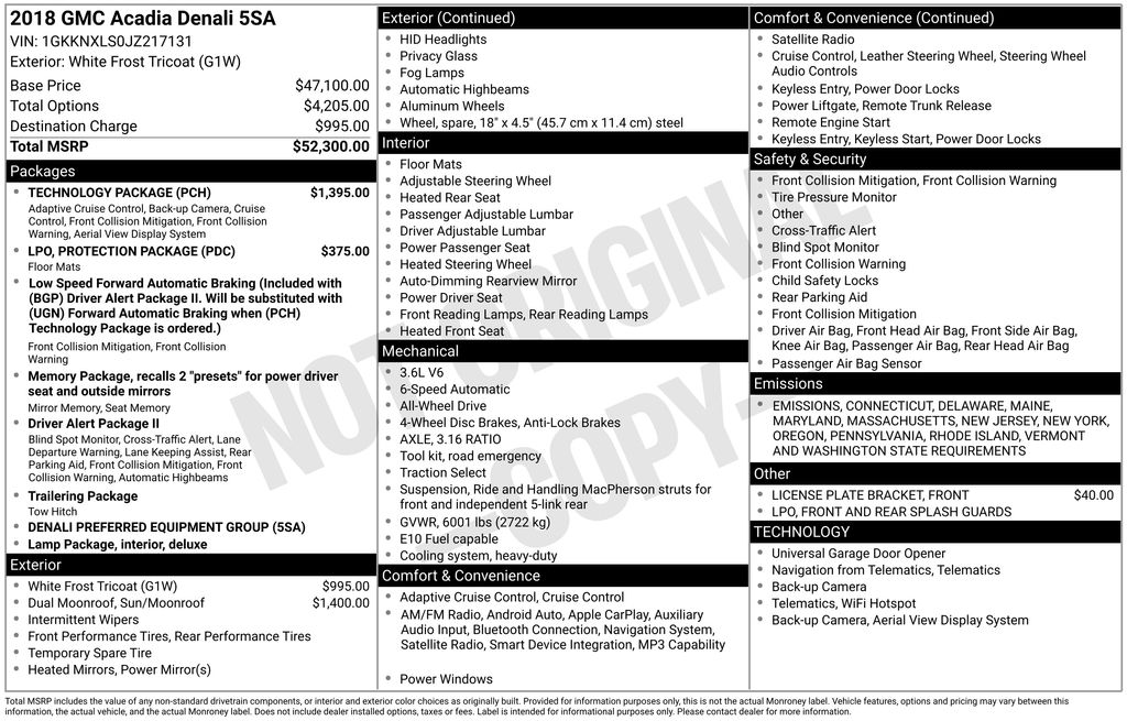 2018 GMC Acadia Denali White Frost Tricoat Acadia Denali, 3.6L V6 SIDI DOHC VVT, AWD, White Frost Tricoat, Jet Black w/Perforated Leather-Appointed Seat Trim, 3rd row seats: split-bench, Apple CarPlay/Android Auto, Auto-dimming Rear-View mirror, Dual SkyScape 2-Panel Power Sunroof, Exterior Parking Camera Rear, Front dual zone A/C, Front fog lights, Fully automatic headlights, Garage door transmitter: HomeLink, Heated front seats, Heated rear seats, Heated steering wheel, High-Intensity Discharge Headlights, Memory seat, Navigation System, Power Liftgate, Rear air conditioning, Ventilated front seats, Wheels: 20" x 8" Polished Aluminum (4), 1st & 2nd Row All Weather Floor Mats (LPO), 3.16 Axle Ratio, 3rd Row All Weather Floor Mats (LPO), 4-Wheel Disc Brakes, 6-Passenger (2-2-2 Seating Configuration), 8 Speakers, ABS brakes, Air Conditioning, AM/FM radio: SiriusXM, Auto High-beam Headlights, Auto-dimming door mirrors, Automatic temperature control, Brake assist, Bumpers: body-color, Compass, Delay-off headlights, Driver door bin, Driver vanity mirror, Dual front impact airbags, Dual front side impact airbags, Electronic Cruise Control w/Set & Resume Speed, Electronic Stability Control, Emergency communication system: OnStar and GMC connected services capable, Forward Automatic Braking, Four wheel independent suspension, Front & Rear Splash Guards, Front anti-roll bar, Front Bucket Seats, Front Center Armrest, Front License Plate Bracket, Front reading lights, Full Speed Adaptive Cruise Control w/Stop/Go, Heated door mirrors, Illuminated entry, Knee airbag, Low tire pressure warning, Occupant sensing airbag, Outside temperature display, Overhead airbag, Overhead console, Panic alarm, Passenger door bin, Passenger vanity mirror, Perforated Leather-Appointed Seat Trim, Power door mirrors, Power driver seat, Power passenger seat, Power steering, Power windows, Preferred Equipment Group 5SA, Premium audio system: GMC Infotainment System, Protection Package, Radio data system, Radio: AM/FM 8" Diagonal Color Touch Navigation, Rear anti-roll bar, Rear reading lights, Rear window defroster, Rear window wiper, Remote keyless entry, Roof rack: rails only, Security system, SiriusXM Satellite Radio, Speed control, Speed-sensing steering, Spoiler, Steering wheel mounted audio controls, Surround Vision System, Tachometer, Technology Package, Telescoping steering wheel, Tilt steering wheel, Traction control, Trip computer, Variably intermittent wipers, Voltmeter, Acadia Denali, 3.6L V6 SIDI DOHC VVT, AWD, White Frost Tricoat, Jet Black w/Perforated Leather-Appointed Seat Trim, 3rd row seats: split-bench, Apple CarPlay/Android Auto, Auto-dimming Rear-View mirror, Dual SkyScape 2-Panel Power Sunroof, Exterior Parking Camera Rear, Front dual zone A/C, Front fog lights, Fully automatic headlights, Garage door transmitter: HomeLink, Heated front seats, Heated rear seats, Heated steering wheel, High-Intensity Discharge Headlights, Memory seat, Navigation System, Power Liftgate, Rear air conditioning, Ventilated front seats, Wheels: 20" x 8" Polished Aluminum (4). 3.6L V6 SIDI DOHC VVT 6-Speed Automatic AWD 4D Sport Utility Awards: