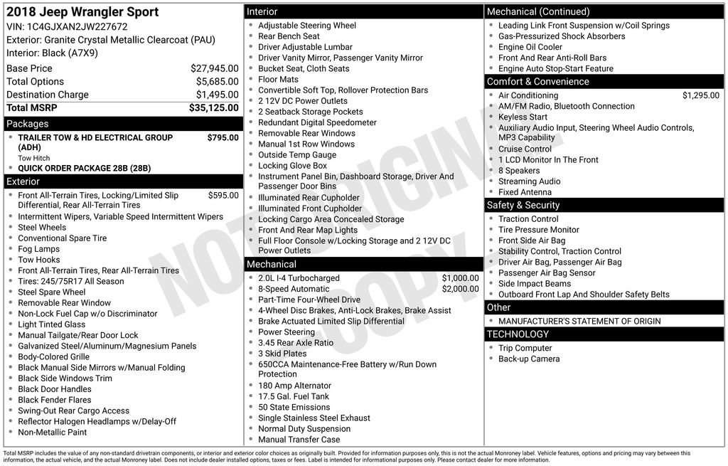 2018 Jeep Wrangler Sport Granite Crystal Metallic Clearcoat Wrangler Sport, 2.0L I4 DOHC, 8-Speed Automatic, 4WD, Granite Crystal Metallic Clearcoat, Black Cloth, 240 Amp Alternator, 7 & 4 Pin Wiring Harness, 700 Amp Maintenance Free Battery, Anti-Spin Differential Rear Axle, Auxiliary Switches, Class II Receiver Hitch, Front fog lights, ParkView Rear Back-Up Camera, Trailer Tow & HD Electrical Group, 3.45 Rear Axle Ratio, 4-Wheel Disc Brakes, 8 Speakers, ABS brakes, Air Conditioning, AM/FM radio, Brake assist, Cloth Low-Back Bucket Seats, Compass, Delay-off headlights, Driver door bin, Driver vanity mirror, Dual front impact airbags, Dual front side impact airbags, Electronic Stability Control, Front anti-roll bar, Front Bucket Seats, Front Center Armrest w/Storage, Front reading lights, Integrated roll-over protection, Low tire pressure warning, Manufacturer's Statement of Origin (DISC), Non-Lock Fuel Cap w/o Discriminator, Normal Duty Suspension, Occupant sensing airbag, Outside temperature display, Passenger door bin, Passenger vanity mirror, Power steering, Quick Order Package 28B, Radio data system, Radio: Uconnect 3 w/5" Display, Rear anti-roll bar, Rear reading lights, Speed control, Steering wheel mounted audio controls, Tachometer, Telescoping steering wheel, Tilt steering wheel, Traction control, Trip computer, Variably intermittent wipers, Wheels: 17" x 7.5" Black Steel Styled, Wrangler Sport, 2.0L I4 DOHC, 8-Speed Automatic, 4WD, Granite Crystal Metallic Clearcoat, Black Cloth, 240 Amp Alternator, 7 & 4 Pin Wiring Harness, 700 Amp Maintenance Free Battery, Anti-Spin Differential Rear Axle, Auxiliary Switches, Class II Receiver Hitch, Front fog lights, ParkView Rear Back-Up Camera, Trailer Tow & HD Electrical Group. 2.0L I4 DOHC 8-Speed Automatic 4WD 2D Sport Utility Odometer is 22261 miles below market average! Awards: