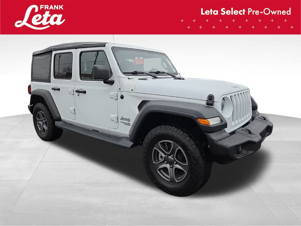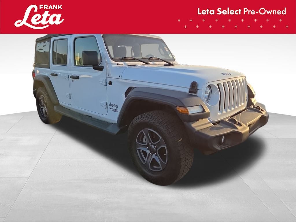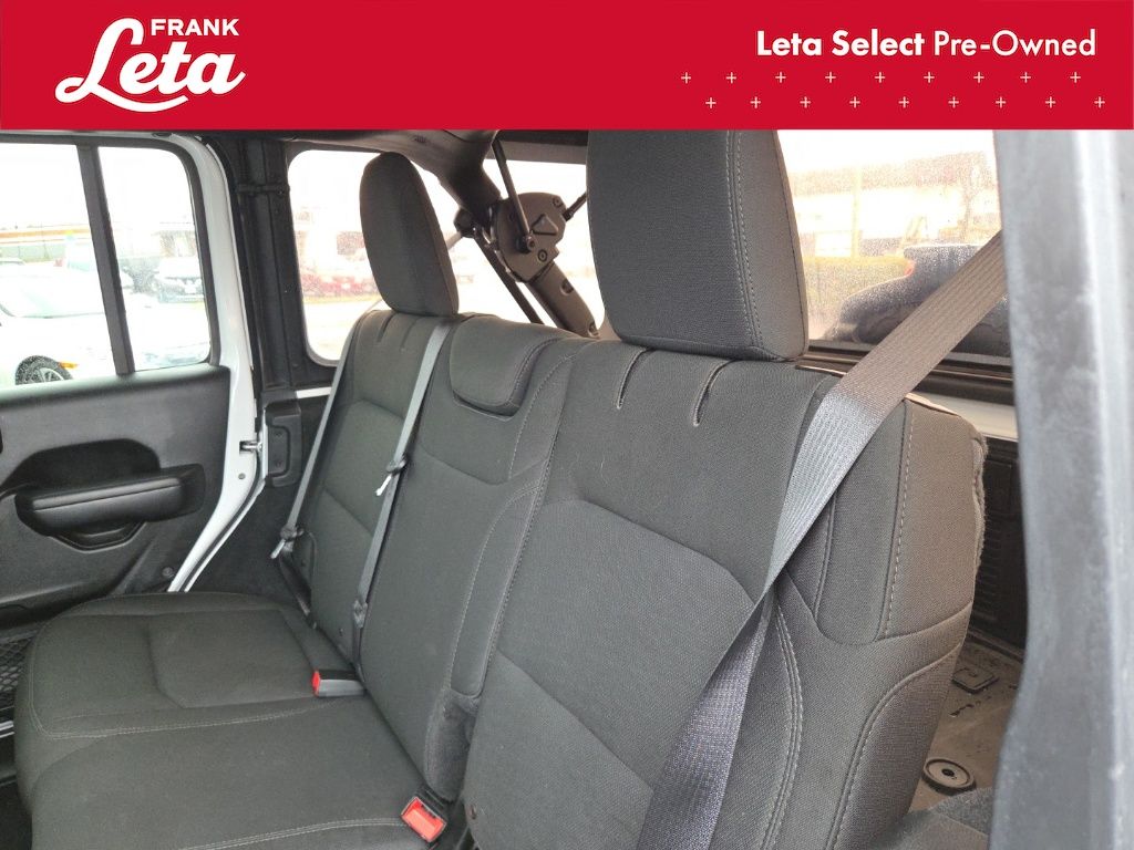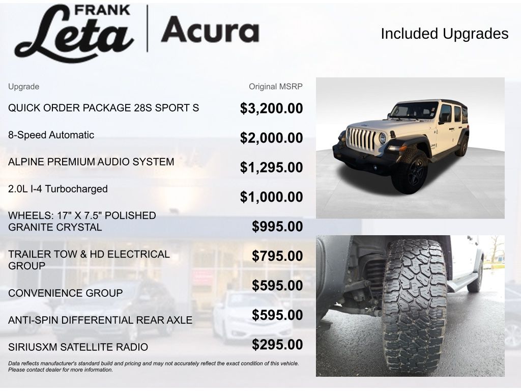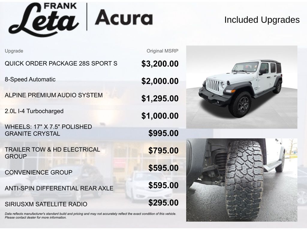 2018 Jeep Wrangler Unlimited Sport S Bright White Clearcoat Wrangler Unlimited Sport S, Frank Leta Select Certified, 2.0L I4 DOHC, 4WD, Bright White Clearcoat, Black w/Cloth Low-Back Bucket Seats, 240 Amp Alternator, 7 & 4 Pin Wiring Harness, 700 Amp Maintenance Free Battery, Anti-Spin Differential Rear Axle, Automatic Headlamps, Auxiliary Switches, Class II Receiver Hitch, Front fog lights, Leather Wrapped Steering Wheel, ParkView Rear Back-Up Camera, Power Heated Mirrors, Trailer Tow & HD Electrical Group, Universal Garage Door Opener, 1-Yr SiriusXM Radio Service, 21.5 Gallon Fuel Tank (DISC), 220 Amp Alternator, 3.45 Rear Axle Ratio, 4-Wheel Disc Brakes, 8 Speakers, ABS brakes, Air Conditioning, Alpine Premium Audio System, AM/FM radio, Brake assist, Cloth Low-Back Bucket Seats, Compass, Convenience Group, Deep Tint Sunscreen Windows, Delay-off headlights, Driver door bin, Driver vanity mirror, Dual front impact airbags, Dual front side impact airbags, Electronic Stability Control, Front 1-Touch Down Power Windows, Front anti-roll bar, Front Bucket Seats, Front Center Armrest w/Storage, Front reading lights, Integrated roll-over protection, Low tire pressure warning, Non-Lock Fuel Cap w/o Discriminator, Normal Duty Suspension, Occupant sensing airbag, Outside temperature display, Passenger door bin, Passenger vanity mirror, Power steering, Quick Order Package 28S Sport S, Radio data system, Radio: Uconnect 3 w/5" Display, Rear anti-roll bar, Rear reading lights, Remote Keyless Entry, Security Alarm, SiriusXM Satellite Radio, Speed control, Speed Sensitive Power Locks, Split folding rear seat, Steering wheel mounted audio controls, Sun Visors w/Illuminated Vanity Mirrors, Tachometer, Telescoping steering wheel, Tilt steering wheel, Traction control, Trip computer, Variably intermittent wipers, Wheels: 17" x 7.5" Polished Granite Crystal, Wrangler Unlimited Sport S, 2.0L I4 DOHC, 4WD, Bright White Clearcoat, Black w/Cloth Low-Back Bucket Seats, 240 Amp Alternator, 7 & 4 Pin Wiring Harness, 700 Amp Maintenance Free Battery, Anti-Spin Differential Rear Axle, Automatic Headlamps, Auxiliary Switches, Class II Receiver Hitch, Front fog lights, Leather Wrapped Steering Wheel, ParkView Rear Back-Up Camera, Power Heated Mirrors, Trailer Tow & HD Electrical Group, Universal Garage Door Opener. 2.0L I4 DOHC 8-Speed Automatic 4WD 4D Sport Utility Awards: