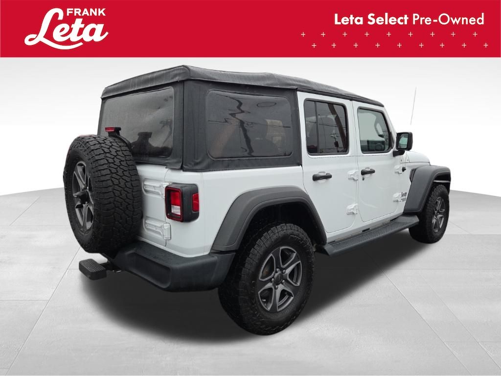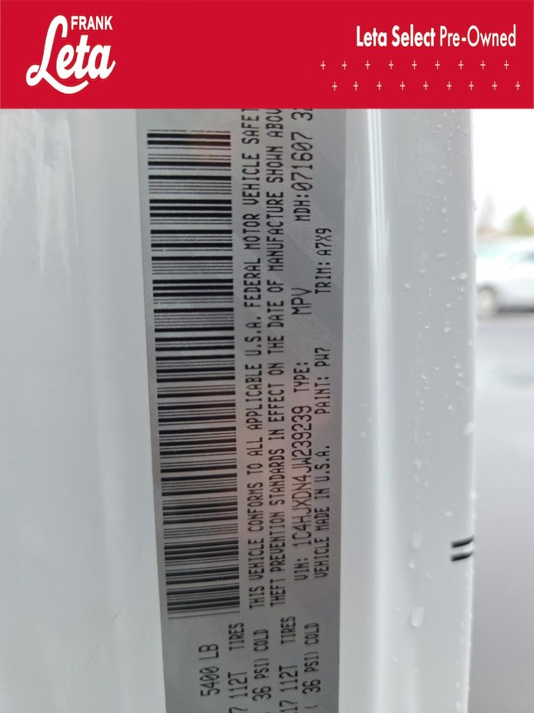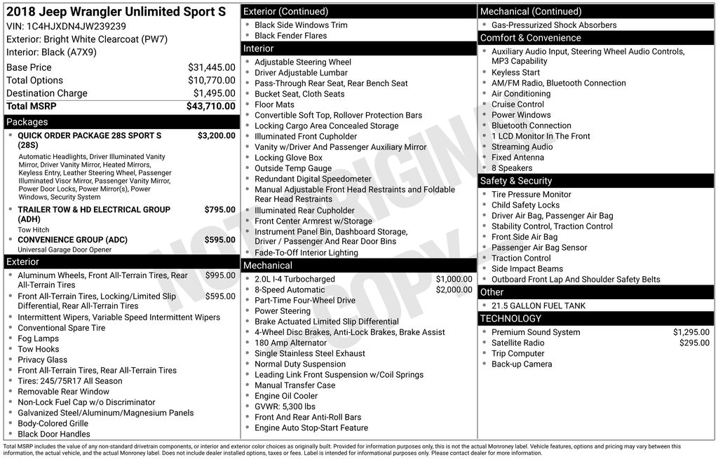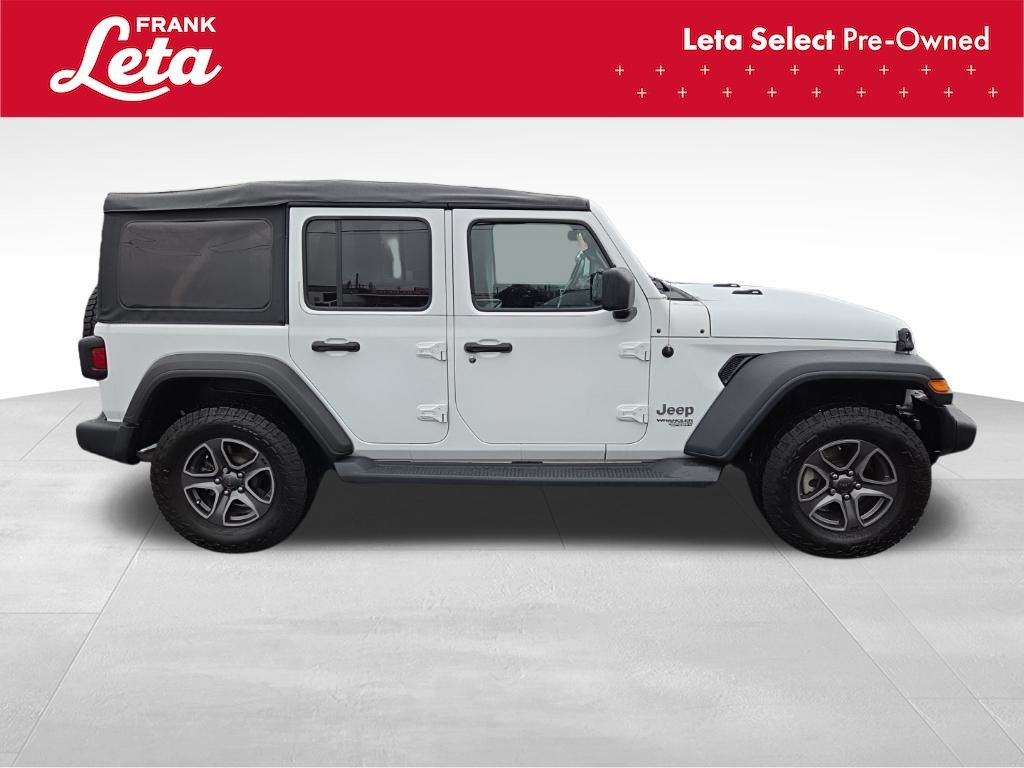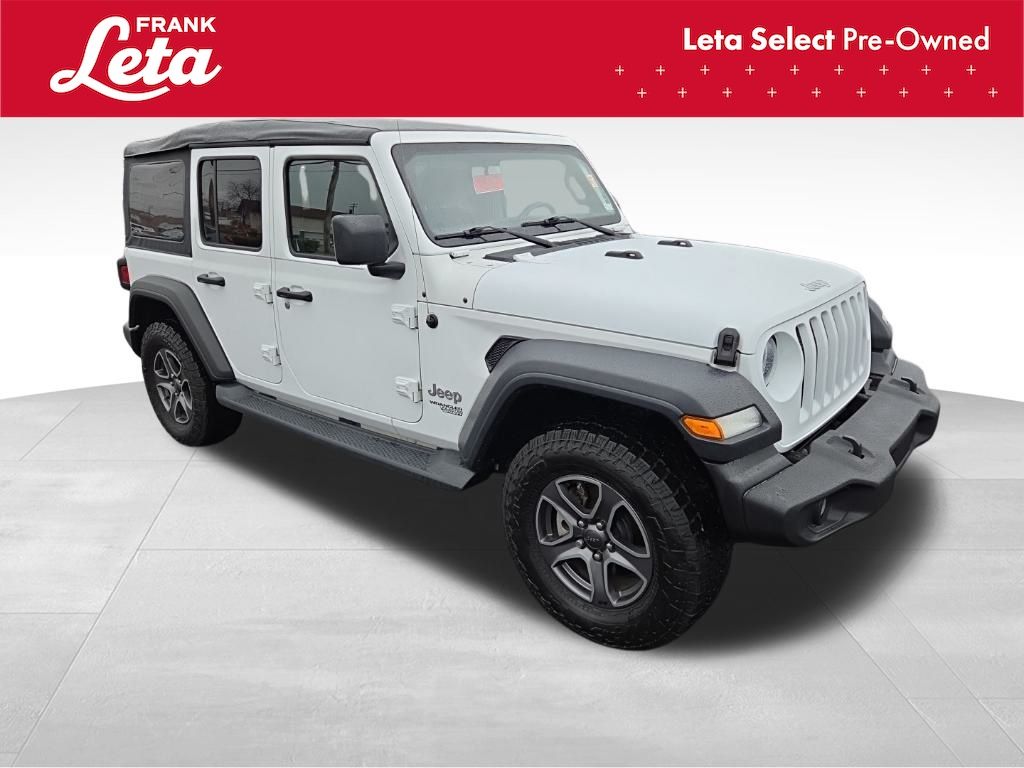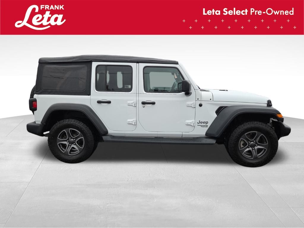 2018 Jeep Wrangler Unlimited Sport S Bright White Clearcoat Wrangler Unlimited Sport S, Frank Leta Select Certified, 2.0L I4 DOHC, 4WD, Bright White Clearcoat, Black w/Cloth Low-Back Bucket Seats, 240 Amp Alternator, 7 & 4 Pin Wiring Harness, 700 Amp Maintenance Free Battery, Anti-Spin Differential Rear Axle, Automatic Headlamps, Auxiliary Switches, Class II Receiver Hitch, Front fog lights, Leather Wrapped Steering Wheel, ParkView Rear Back-Up Camera, Power Heated Mirrors, Trailer Tow & HD Electrical Group, Universal Garage Door Opener, 1-Yr SiriusXM Radio Service, 21.5 Gallon Fuel Tank (DISC), 220 Amp Alternator, 3.45 Rear Axle Ratio, 4-Wheel Disc Brakes, 8 Speakers, ABS brakes, Air Conditioning, Alpine Premium Audio System, AM/FM radio, Brake assist, Cloth Low-Back Bucket Seats, Compass, Convenience Group, Deep Tint Sunscreen Windows, Delay-off headlights, Driver door bin, Driver vanity mirror, Dual front impact airbags, Dual front side impact airbags, Electronic Stability Control, Front 1-Touch Down Power Windows, Front anti-roll bar, Front Bucket Seats, Front Center Armrest w/Storage, Front reading lights, Integrated roll-over protection, Low tire pressure warning, Non-Lock Fuel Cap w/o Discriminator, Normal Duty Suspension, Occupant sensing airbag, Outside temperature display, Passenger door bin, Passenger vanity mirror, Power steering, Quick Order Package 28S Sport S, Radio data system, Radio: Uconnect 3 w/5" Display, Rear anti-roll bar, Rear reading lights, Remote Keyless Entry, Security Alarm, SiriusXM Satellite Radio, Speed control, Speed Sensitive Power Locks, Split folding rear seat, Steering wheel mounted audio controls, Sun Visors w/Illuminated Vanity Mirrors, Tachometer, Telescoping steering wheel, Tilt steering wheel, Traction control, Trip computer, Variably intermittent wipers, Wheels: 17" x 7.5" Polished Granite Crystal, Wrangler Unlimited Sport S, 2.0L I4 DOHC, 4WD, Bright White Clearcoat, Black w/Cloth Low-Back Bucket Seats, 240 Amp Alternator, 7 & 4 Pin Wiring Harness, 700 Amp Maintenance Free Battery, Anti-Spin Differential Rear Axle, Automatic Headlamps, Auxiliary Switches, Class II Receiver Hitch, Front fog lights, Leather Wrapped Steering Wheel, ParkView Rear Back-Up Camera, Power Heated Mirrors, Trailer Tow & HD Electrical Group, Universal Garage Door Opener. 2.0L I4 DOHC 8-Speed Automatic 4WD 4D Sport Utility Awards: