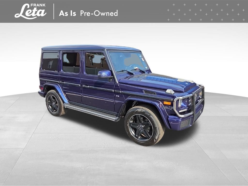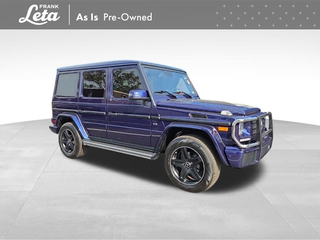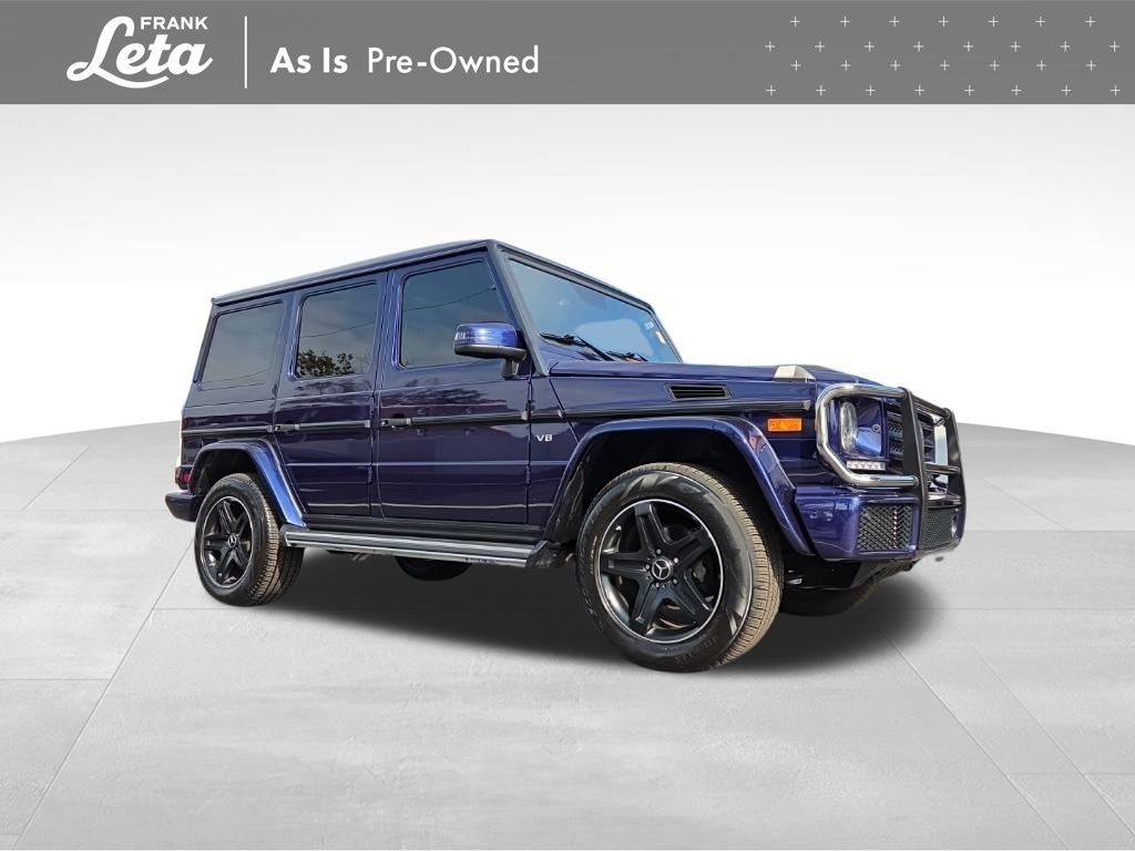 2018 Mercedes-Benz G-Class G 550 4MATIC designo Mystic Blue Metallic G 550 4MATIC, 4.0L V8, 7G-TRONIC 7-Speed Automatic, 4MATIC, designo Mystic Blue Metallic, designo Black w/designo Nappa Leather Upholstery, 12 Speakers, Apple CarPlay/Android Auto, Auto-dimming door mirrors, Auto-dimming Rear-View mirror, Exterior Parking Camera Rear, Front dual zone A/C, Garage door transmitter: Homelink, harman/kardon Speakers, Heated front seats, Heated rear seats, Heated steering wheel, High intensity discharge headlights: Bi-Xenon, Memory seat, Navigation system: COMAND APS, Perforated Nappa Leather Upholstery, Power Heated & Ventilated Front Seats, Power moonroof, Ventilated front seats, Wheels: 19" AMG 5-Spoke Light-Alloy Black, 4-Wheel Disc Brakes, ABS brakes, Air Conditioning, AM/FM radio: SiriusXM, Anti-whiplash front head restraints, Auto High-beam Headlights, Auto tilt-away steering wheel, Automatic temperature control, Axle Ratio: 3.58, Bodyside moldings, Brake assist, Bumpers: body-color, CD player, Child-Seat-Sensing Airbag, Compass, Delay-off headlights, designo Black DINAMICA Headliner, Driver door bin, Driver vanity mirror, Dual front impact airbags, DVD-Audio, Electronic Stability Control, Emergency communication system: mbrace2, Front anti-roll bar, Front Bucket Seats, Front Center Armrest w/Storage, Front reading lights, Genuine wood console insert, Genuine wood dashboard insert, Genuine wood door panel insert, Head restraints memory, Headlight cleaning, Heated door mirrors, Illuminated entry, Leather steering wheel, Low tire pressure warning, Occupant sensing airbag, Outside temperature display, Overhead airbag, Overhead console, Panic alarm, Passenger door bin, Passenger vanity mirror, Power adjustable front head restraints, Power door mirrors, Power driver seat, Power passenger seat, Power steering, Power windows, Radio: COMAND w/Navigation, Rain sensing wipers, Rear fog lights, Rear reading lights, Rear window defroster, Rear window wiper, Remote keyless entry, Security system, Speed control, Split folding rear seat, Steering wheel memory, Steering wheel mounted audio controls, Tachometer, Telescoping steering wheel, Tilt steering wheel, Traction control, Trip computer, Turn signal indicator mirrors, Variably intermittent wipers, G 550 4MATIC, 4.0L V8, 7G-TRONIC 7-Speed Automatic, 4MATIC, designo Mystic Blue Metallic, designo Black w/designo Nappa Leather Upholstery, 12 Speakers, Apple CarPlay/Android Auto, Auto-dimming door mirrors, Auto-dimming Rear-View mirror, Exterior Parking Camera Rear, Front dual zone A/C, Garage door transmitter: Homelink, harman/kardon Speakers, Heated front seats, Heated rear seats, Heated steering wheel, High intensity discharge headlights: Bi-Xenon, Memory seat, Navigation system: COMAND APS, Perforated Nappa Leather Upholstery, Power Heated & Ventilated Front Seats, Power moonroof, Ventilated front seats, Wheels: 19" AMG 5-Spoke Light-Alloy Black. 4.0L V8 7G-TRONIC 7-Speed Automatic 4MATIC 4D Sport Utility