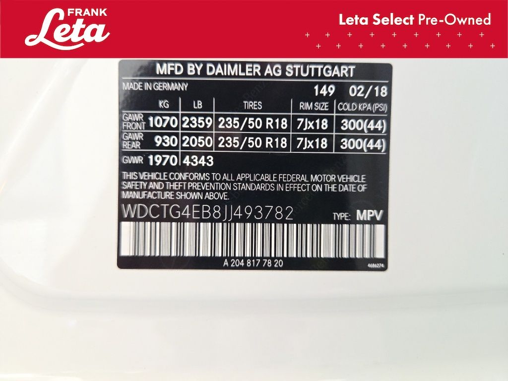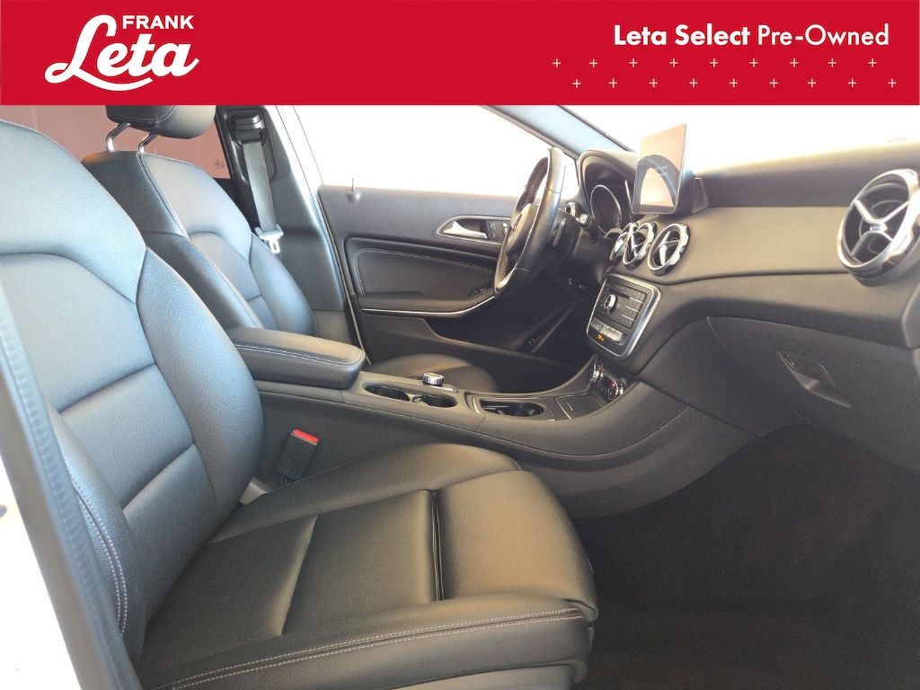 2018 Mercedes-Benz GLA GLA 250 Cirrus White GLA 250, Frank Leta Select Certified, 2.0L I4 DI Turbocharged, FWD, Cirrus White, Black w/MB-Tex Upholstery, 18" 5-Spoke Aluminum Wheels, Exterior Parking Camera Rear, Front dual zone A/C, Front fog lights, Fully automatic headlights, Memory seat, Power Liftgate, Power passenger seat, 4-Wheel Disc Brakes, 8 Speakers, ABS brakes, Air Conditioning, AM/FM radio, Automatic temperature control, Axle Ratio: 4.60, Brake assist, Bumpers: body-color, CD player, Child-Seat-Sensing Airbag, Delay-off headlights, Driver door bin, Driver vanity mirror, Dual front impact airbags, Dual front side impact airbags, Electronic Stability Control, Emergency communication system: mbrace, Four wheel independent suspension, Front anti-roll bar, Front Bucket Seats, Front Center Armrest, Front Power Seats, Front reading lights, Heated door mirrors, Illuminated entry, Knee airbag, Low tire pressure warning, MB-Tex Upholstery, Occupant sensing airbag, Outside temperature display, Overhead airbag, Overhead console, Panic alarm, Passenger door bin, Passenger vanity mirror, Power door mirrors, Power driver seat, Power steering, Power windows, Radio data system, Radio: Audio 20 CD w/Garmin Navigation Pre-Wiring, Rain sensing wipers, Rear anti-roll bar, Rear fog lights, Rear reading lights, Rear seat center armrest, Rear window defroster, Rear window wiper, Remote keyless entry, Roof rack: rails only, Security system, Speed control, Speed-sensing steering, Split folding rear seat, Spoiler, Steering wheel mounted audio controls, Tachometer, Telescoping steering wheel, Tilt steering wheel, Traction control, Trip computer, Turn signal indicator mirrors, Variably intermittent wipers, Weather band radio, GLA 250, 2.0L I4 DI Turbocharged, FWD, Cirrus White, Black w/MB-Tex Upholstery, 18" 5-Spoke Aluminum Wheels, Exterior Parking Camera Rear, Front dual zone A/C, Front fog lights, Fully automatic headlights, Memory seat, Power Liftgate, Power passenger seat. 2.0L I4 DI Turbocharged 7-Speed Automatic FWD 4D Sport Utility 24/33 City/Highway MPG Awards: