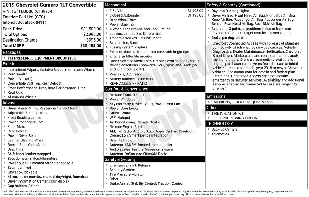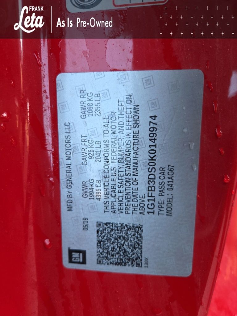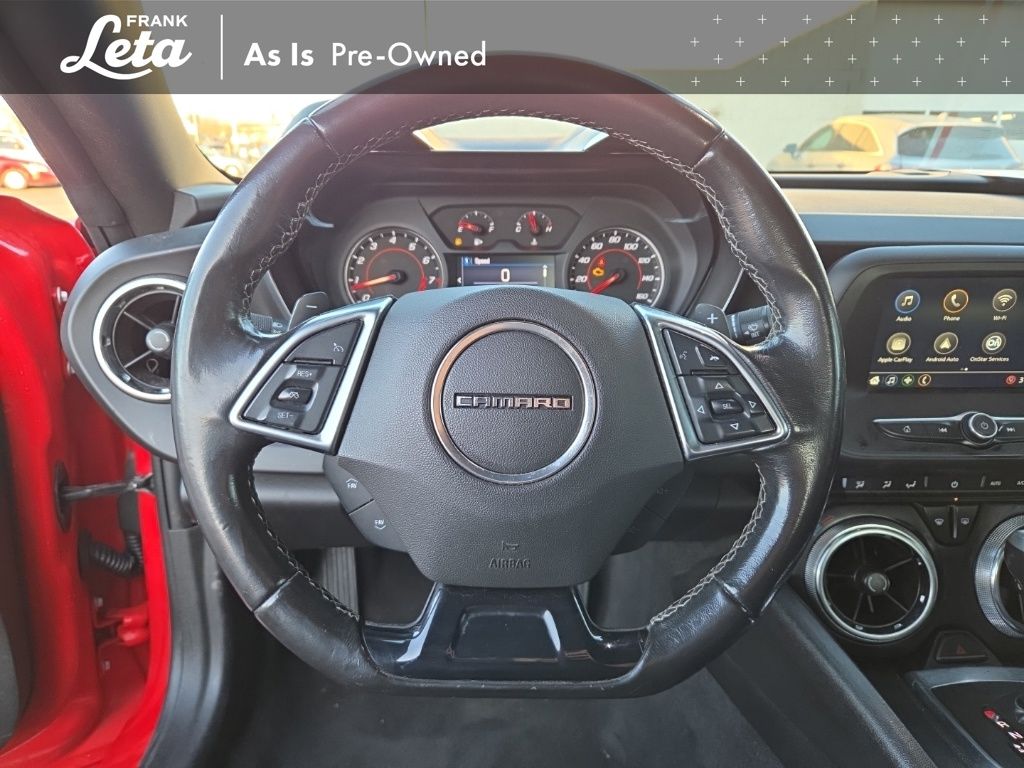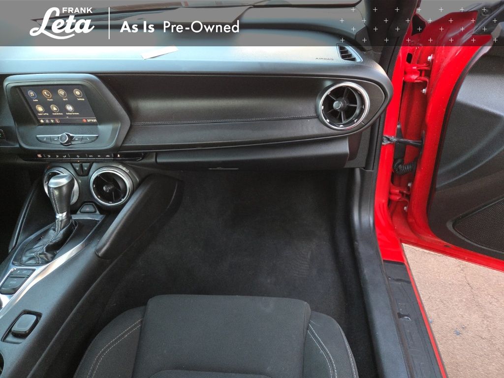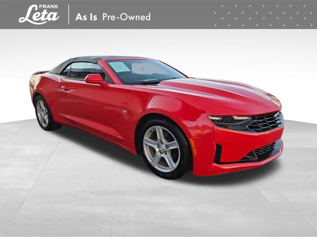 2019 Chevrolet Camaro 1LT Red Hot Camaro 1LT, Frank Leta Select Certified, 2D Convertible, 3.6L V6 DI, Red Hot, Jet Black w/Cloth Seat Trim, 18" Silver-Painted Aluminum Wheels, Apple CarPlay/Android Auto, Exterior Parking Camera Rear, Fully automatic headlights, 2.77 Rear Axle Ratio, 4-Wheel Disc Brakes, 6 Speakers, 6-Speaker Audio System Feature, 6-Way Power Front Passenger Seat Adjuster, 8-Way Power Driver Seat Adjuster, ABS brakes, Air Conditioning, AM/FM radio: SiriusXM, Automatic temperature control, Bluetooth For Phone, Brake assist, Bumpers: body-color, Cloth Seat Trim, Compass, Convertible roof lining, Delay-off headlights, Driver door bin, Driver vanity mirror, Dual front impact airbags, Dual front side impact airbags, Electronic Stability Control, Four wheel independent suspension, Front anti-roll bar, Front Bucket Seats, Front Center Armrest, Front reading lights, Front Sport Bucket Seats, Glass rear window, Illuminated entry, Knee airbag, Leather Shift Knob, Low tire pressure warning, Occupant sensing airbag, Paddle-Shift Manual Controls, Panic alarm, Passenger door bin, Passenger vanity mirror, Power convertible roof, Power door mirrors, Power driver seat, Power passenger seat, Power steering, Power windows, Preferred Equipment Group 1LT, Premium audio system: Chevrolet Infotainment System, Radio data system, Radio: Chevrolet Infotainment 3 System, Rear anti-roll bar, Rear window defroster, Remote keyless entry, Remote Vehicle Starter System, Security system, SiriusXM Radio, Speed control, Speed-sensing steering, Spoiler, Steering wheel mounted audio controls, Tachometer, Telescoping steering wheel, Tilt steering wheel, Tire Inflation Kit, Traction control, Trip computer, Variably intermittent wipers, Voltmeter, Camaro 1LT, 2D Convertible, 3.6L V6 DI, Red Hot, Jet Black w/Cloth Seat Trim, 18" Silver-Painted Aluminum Wheels, Apple CarPlay/Android Auto, Exterior Parking Camera Rear, Fully automatic headlights. 3.6L V6 DI 8-Speed Automatic RWD 2D Convertible Odometer is 13502 miles below market average! 19/29 City/Highway MPG Awards: