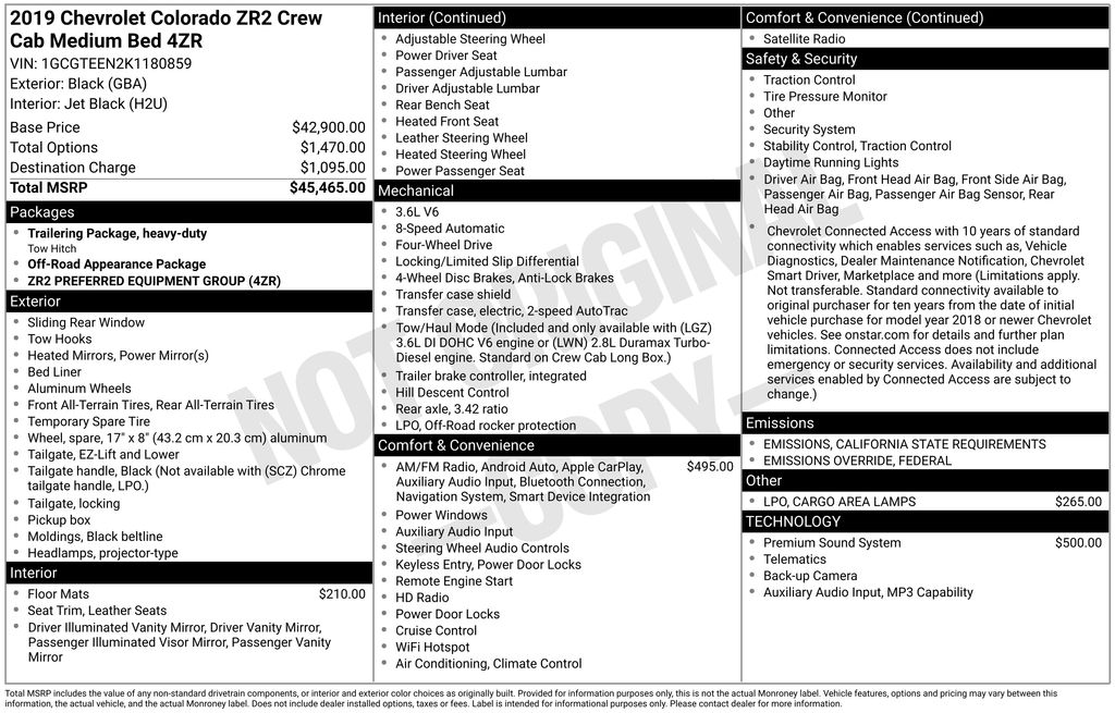 2019 Chevrolet Colorado ZR2 Black Colorado ZR2, Frank Leta Select Certified, V6, 4WD, Black, Jet Black w/Leather-Appointed Seat Trim, 17" x 8" Aluminum Wheels, Apple CarPlay, Auto-dimming Rear-View mirror, Bose Premium 7-Speaker Audio System Feature, Exterior Parking Camera Rear, Fully automatic headlights, Heated front seats, Trailering Assist Guideline Hitch Guidance, 2 USB Data Ports w/SD Card Reader, 3.42 Rear Axle Ratio, 4-Way Power Front Passenger Seat Adjuster, 4-Wheel Disc Brakes, ABS brakes, Air Conditioning, All-Weather Floor Liner (LPO), AM/FM radio: SiriusXM, Automatic temperature control, Black Rear Bumpers, Black Spray-On Bedliner w/Chevrolet Logo, Cargo Area Lamps (LPO), Compass, Delay-off headlights, Driver 6-Way Power Seat Adjuster, Driver door bin, Driver vanity mirror, Driver-Selectable Full-Locking Front Differential, Driver-Selectable Full-Locking Rear Differential, Dual front impact airbags, Dual front side impact airbags, Electronic Stability Control, Front anti-roll bar, Front Bucket Seats, Front Center Armrest, Front fog lights, Front reading lights, Front wheel independent suspension, HD Radio, Heated door mirrors, Heated Driver & Front Passenger Seats, Heated steering wheel, Heavy-Duty Trailering Package, Illuminated entry, Integrated Trailer Brake Controller, Leather-Appointed Seat Trim, Low tire pressure warning, Occupant sensing airbag, Off-Road Appearance Package, Outside temperature display, Overhead airbag, Overhead console, Panic alarm, Passenger door bin, Passenger vanity mirror, Power door mirrors, Power Driver Lumbar Control Seat Adjuster, Power driver seat, Power Passenger Lumbar Control Seat Adjuster, Power passenger seat, Power steering, Power windows, Preferred Equipment Group 4ZR, Premium audio system: Chevrolet Infotainment System, Radio data system, Radio: Chevrolet Infotainment 3 Plus System, Radio: Chevrolet Infotainment 3 Premium System, Rear reading lights, Rear seat center armrest, Rear step bumper, Rear window defroster, Remote keyless entry, Security system, SiriusXM Radio, Speed control, Speed-sensing steering, Steering wheel mounted audio controls, Tachometer, Telescoping steering wheel, Tilt steering wheel, Tow/Haul Mode, Traction control, Trip computer, Variably intermittent wipers, Colorado ZR2, V6, 4WD, Black, Jet Black w/Leather-Appointed Seat Trim, 17" x 8" Aluminum Wheels, Apple CarPlay, Auto-dimming Rear-View mirror, Bose Premium 7-Speaker Audio System Feature, Exterior Parking Camera Rear, Fully automatic headlights, Heated front seats, Trailering Assist Guideline Hitch Guidance. V6 8-Speed Automatic 4WD 4D Crew Cab Awards:
