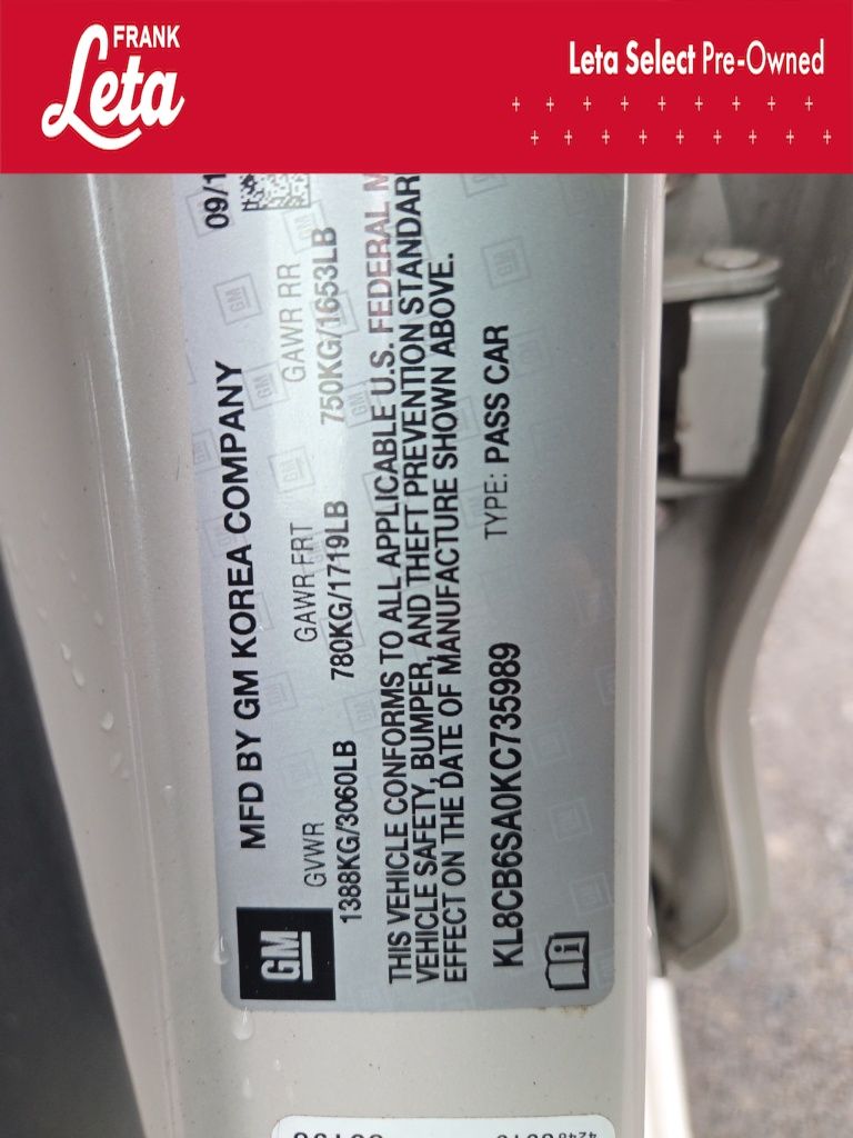 2019 Chevrolet Spark LS Toasted Marshmallow Metallic Spark LS, Frank Leta Select Certified, 1.4L DOHC, Toasted Marshmallow Metallic, Black Cloth, Apple CarPlay/Android Auto, Exterior Parking Camera Rear, Fully automatic headlights, 15" Steel Wheels, 2-Way Manual Front Passenger w/Manual Recline, 3.76 Final Drive Axle Ratio, 4 Speakers, 4-Speaker Audio System Feature, 4-Way Manual Driver Seat Adjuster, ABS brakes, Air Conditioning, AM/FM radio, Brake assist, Bumpers: body-color, Cloth Seat Trim, Delay-off headlights, Driver door bin, Driver Seat Armrest, Driver vanity mirror, Dual front impact airbags, Dual front side impact airbags, Electronic Stability Control, Emergency communication system: OnStar, Front anti-roll bar, Front Bucket Seats, Front High-Back Bucket Seats, Front wheel independent suspension, Knee airbag, Low tire pressure warning, Occupant sensing airbag, Outside temperature display, Overhead airbag, Overhead console, Passenger door bin, Passenger vanity mirror, Power steering, Preferred Equipment Group 1SB, Premium audio system: Chevrolet MyLink, Radio data system, Radio: Chevrolet Infotainment System w/AM/FM, Rear side impact airbag, Rear window defroster, Rear window wiper, Split folding rear seat, Spoiler, Tachometer, Tilt steering wheel, Traction control, Trip computer, Variably intermittent wipers, Spark LS, 1.4L DOHC, Toasted Marshmallow Metallic, Black Cloth, Apple CarPlay/Android Auto, Exterior Parking Camera Rear, Fully automatic headlights. 1.4L DOHC CVT FWD 4D Hatchback Odometer is 24361 miles below market average! 30/38 City/Highway MPG