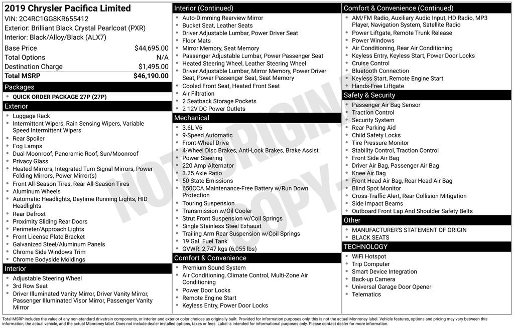 2019 Chrysler Pacifica Limited Brilliant Black Crystal Pearlcoat Pacifica Limited, 4D Passenger Van, FWD, Brilliant Black Crystal Pearlcoat, Black/Alloy w/Cloth Bucket Seats, 13 Speakers, 3rd row seats: split-bench, Apple CarPlay/Android Auto, Auto-dimming door mirrors, Auto-dimming Rear-View mirror, Front dual zone A/C, Front fog lights, Fully automatic headlights, Garage door transmitter, Heated front seats, Heated rear seats, Heated steering wheel, High-Intensity Discharge Headlights, Memory seat, Navigation System, ParkView Rear Back-Up Camera, Power Liftgate, Power moonroof, Quick Order Package 27P, Radio: Uconnect 4C Nav w/8.4" Display, Rear air conditioning, Ventilated front seats, Wheels: 18" x 7.5" Aluminum Polished, 3.25 Axle Ratio, 4-Wheel Disc Brakes, ABS brakes, Air Conditioning, AM/FM radio: SiriusXM, Audio memory, Automatic temperature control, Black Seats, Bodyside moldings, Brake assist, Bumpers: body-color, Compass, Delay-off headlights, Driver door bin, Driver vanity mirror, Driver's Seat Mounted Armrest, Dual front impact airbags, Dual front side impact airbags, Electronic Stability Control, Emergency communication system: SiriusXM Guardian, Four wheel independent suspension, Front anti-roll bar, Front Bucket Seats, Front reading lights, Heated door mirrors, Illuminated entry, Knee airbag, Leather steering wheel, Low tire pressure warning, Manufacturer's Statement of Origin, Occupant sensing airbag, Outside temperature display, Overhead airbag, Overhead console, Panic alarm, Passenger door bin, Passenger seat mounted armrest, Passenger vanity mirror, Power door mirrors, Power driver seat, Power passenger seat, Power steering, Power windows, Premium Leather Trim Bucket Seats, Radio data system, Rain sensing wipers, Rear reading lights, Rear window defroster, Rear window wiper, Reclining 3rd row seat, Remote keyless entry, Roof rack, Security system, Speed control, Split folding rear seat, Spoiler, Steering wheel mounted audio controls, Tachometer, Telescoping steering wheel, Tilt steering wheel, Touring Suspension, Traction control, Trip computer, Turn signal indicator mirrors, Variably intermittent wipers, Voltmeter, Pacifica Limited, 4D Passenger Van, FWD, Brilliant Black Crystal Pearlcoat, Black/Alloy w/Cloth Bucket Seats, 13 Speakers, 3rd row seats: split-bench, Apple CarPlay/Android Auto, Auto-dimming door mirrors, Auto-dimming Rear-View mirror, Front dual zone A/C, Front fog lights, Fully automatic headlights, Garage door transmitter, Heated front seats, Heated rear seats, Heated steering wheel, High-Intensity Discharge Headlights, Memory seat, Navigation System, ParkView Rear Back-Up Camera, Power Liftgate, Power moonroof, Quick Order Package 27P, Radio: Uconnect 4C Nav w/8.4" Display, Rear air conditioning, Ventilated front seats, Wheels: 18" x 7.5" Aluminum Polished. 3.6L V6 24V VVT 9-Speed 948TE Automatic FWD 4D Passenger Van Odometer is 8356 miles below market average! 19/28 City/Highway MPG Awards: